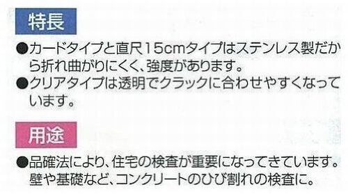 ●折れ曲がりにくく、強度があります。●コンクリートのひび割れ検査に使用するクラックスケール●折れ曲がりにくく、強度があります。●消えにくいエッチング目盛です。●携帯に便利な名刺サイズ。●製品サイズ/縦:55mm横:91mm高さ:.3mm●製品重量:12g●パッケージサイズ/縦:140mm横:70mm高さ:.36mm●パッケージ重量:14g●材質:ステンレス●クラック目盛線幅:+-0.05mm●cm目盛長さの許容差:80mm+-0.15mm●こちらの商品はゆうパケット(メール便)での発送となります。●商品のお届けには、発送日から2~3営業日でのお届け予定です。●宅配便とは異なり、ポスト投函でのお届けです。●日時指定、代金引換、熨斗や包装のご要望はお受けできませんこと予めご了承ください。
