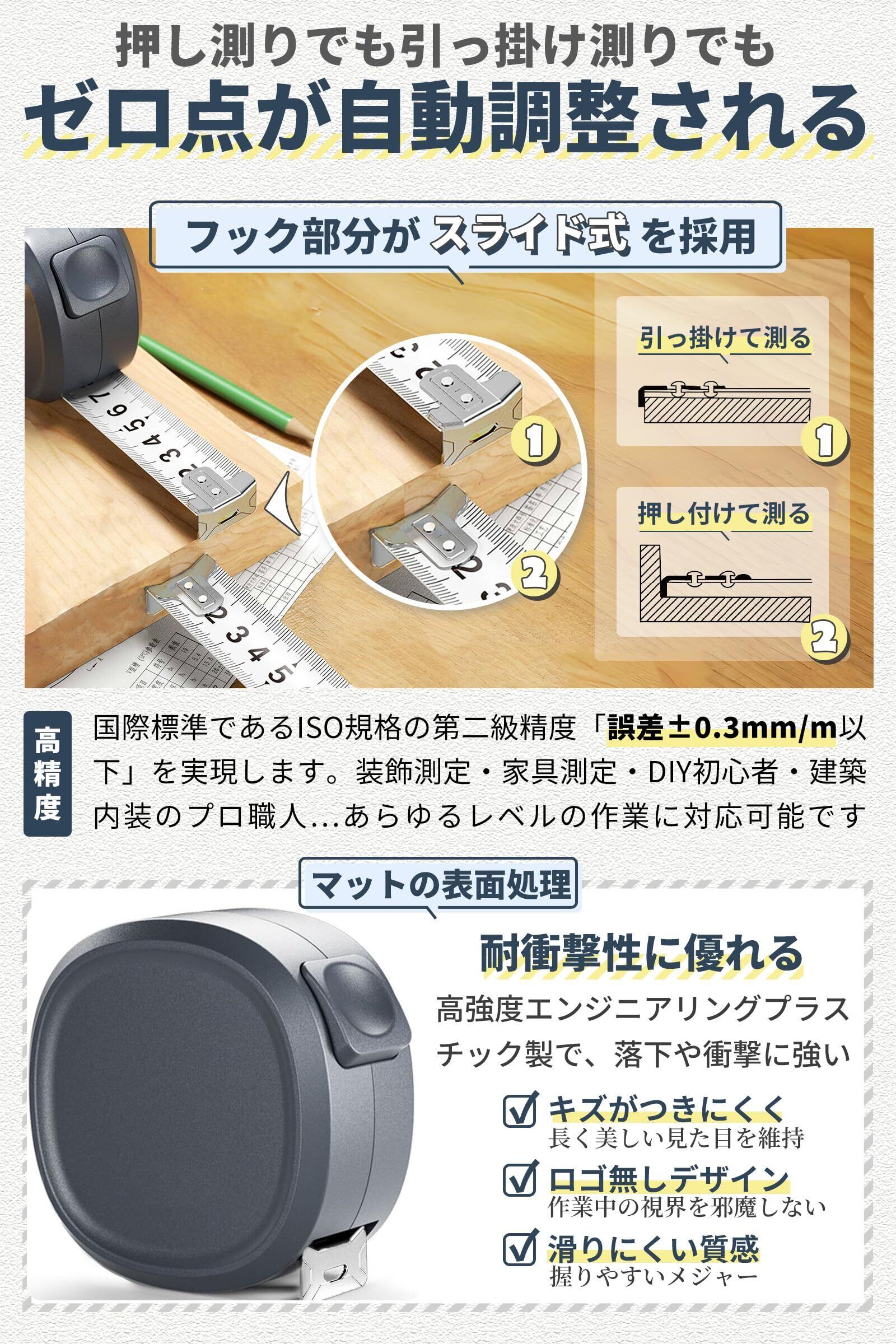 【ゼロ点自動調整】巻尺のフック部分にスライド式を採用。押し測りでも引っ掛け測りでも、ゼロ点が自動調整されます。第二級精度(誤差±0.3mm/m以下)を実現しております。DIYやリフォーム、プロ作業にも対応します