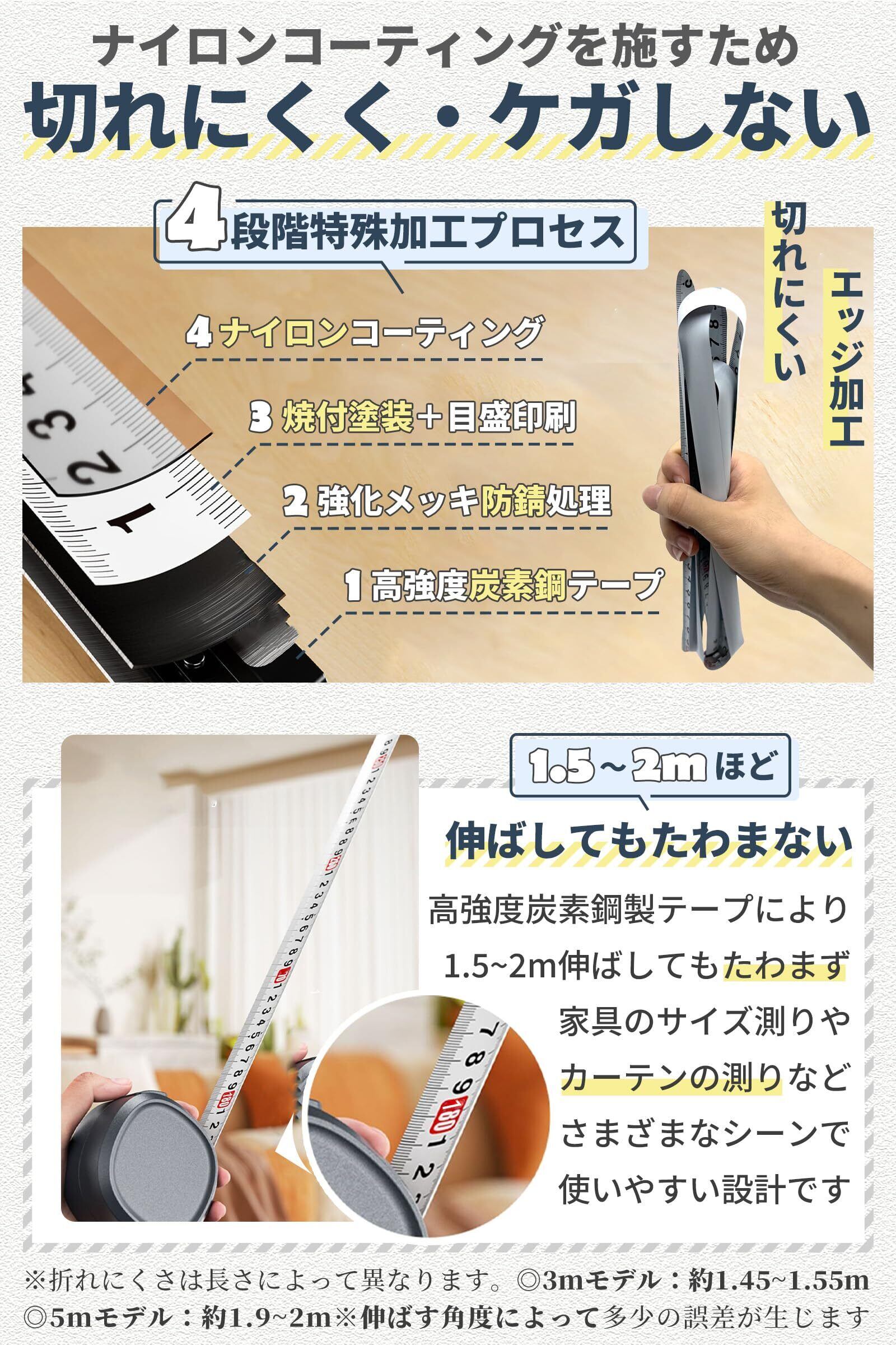 【切れにくく、ケガしないテープ】テープのエッジまでナイロンコーティングを施すため、ケガ防止!高強度カーボンスチール製で、1.5~2mほど伸ばしてもたわまず、家具やカーテンの測定に最適なスケールです