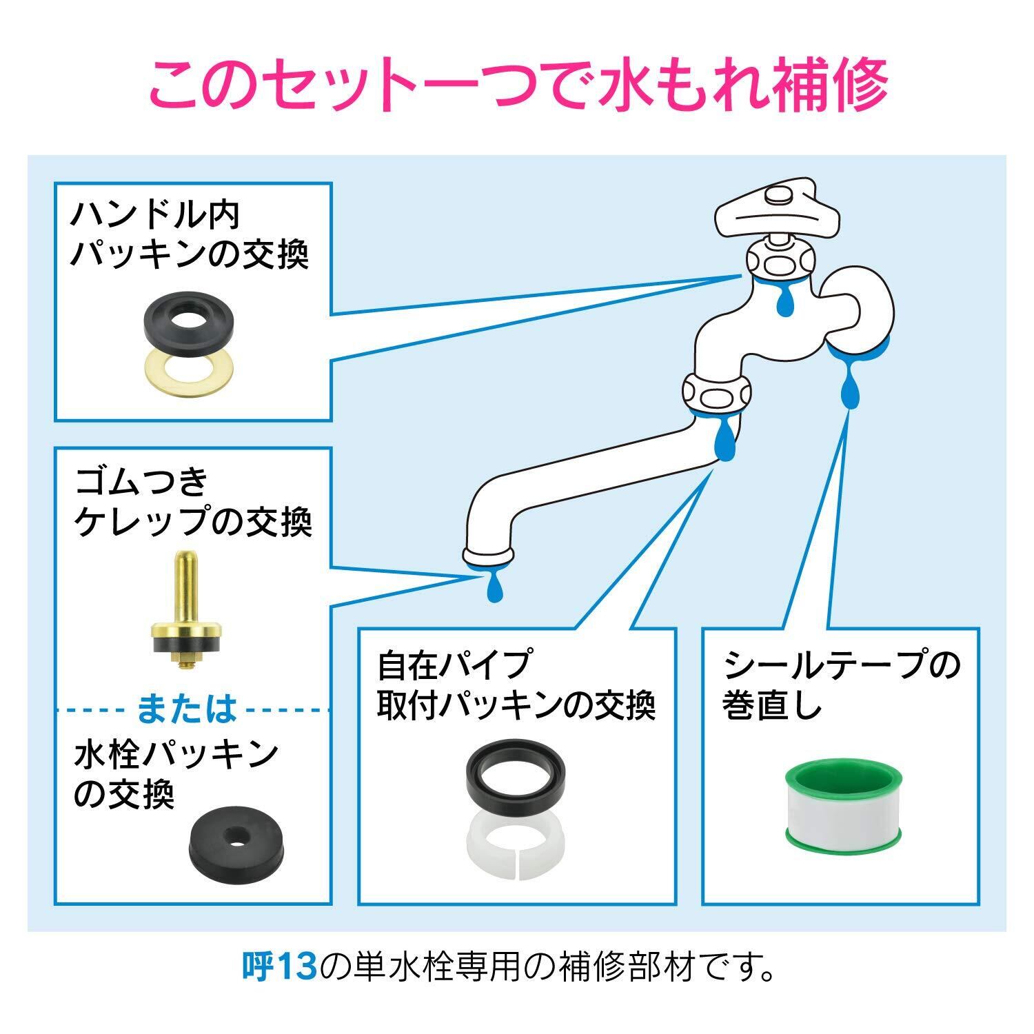 自在水栓の修理に必要な部材のセット【用途】呼13の蛇口自在水栓の修理作業【特徴】・これ一つあれば呼13の蛇口の修理は安心・吐水口からの水もれはゴムつきケレップまたは水栓パッキンで補修できる・パイプの根元からの水もれは自在パイプ取付パッキンで補修できる・ハンドル下ナットからの水もれは水栓ハンドル内パッキンで補修できる・水栓と壁の間からの水もれはシールテープ(1m)で補修できる