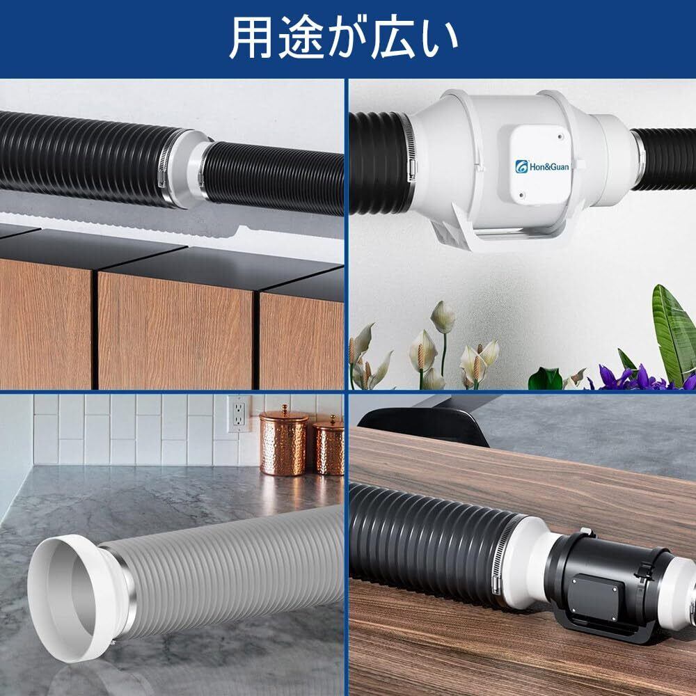 【簡単な操作】100mm排気ホース+ホースバンド+異径カップリング+ホースバンド+150mm排気ホース。フレキシブルホースやアルミダクトなど幅広いホースに対応しており、配管のインストールが簡単で迅速に行えるため、時間と労力を節約することができます。