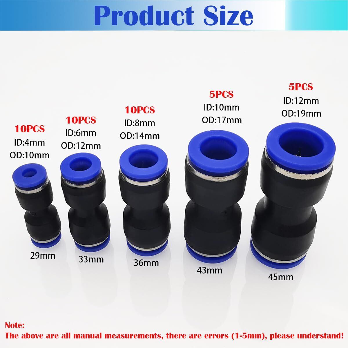 ◢包装内容明細書:I型クイックコネクタ(10個*4mm; 10個*6mm; 10個*8mm; 5個*10mm; 5個*12mm)