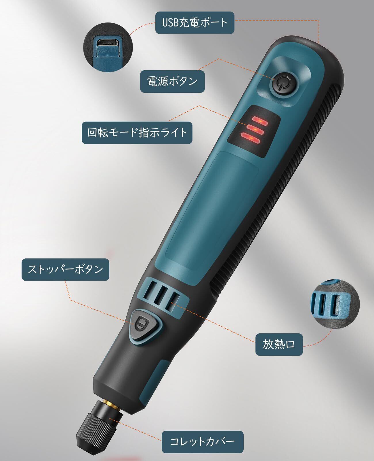 特徴 可変速, コードレス, 握りやすいペン型