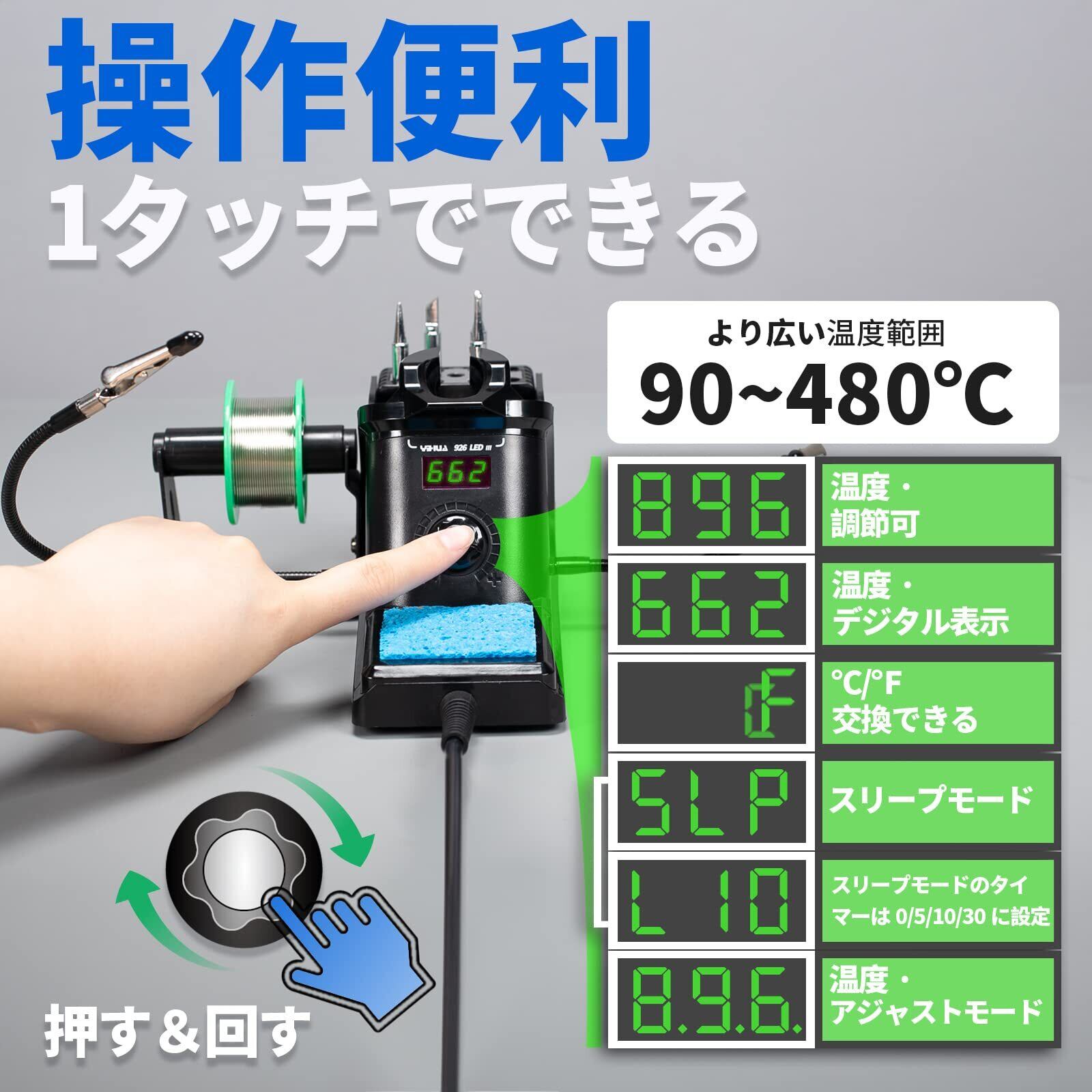 YIHUA 926LED III はんだこてセット 2つの調整可能なアーム付き デジタル表示 温度制御型90°C~480°C °C/ºF表示 スリープモード アジャストモード 5xこて先 1x鉛フリーはんだ 1 x はんだリール台 1 x はんだ吸取器 1 x ピンセット 1 x スパナ 1 x クリーニングスポンジ 1x日本語取扱説明書 コンパクトはんだごて