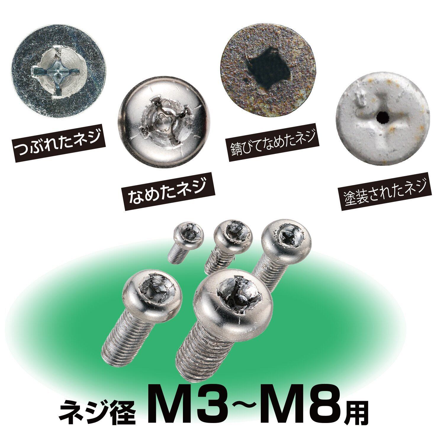 ●破損が多いネジ部は、ネジはずしに最適な先端角度でネジ山に食い込みやすく、耐久性も高い 。