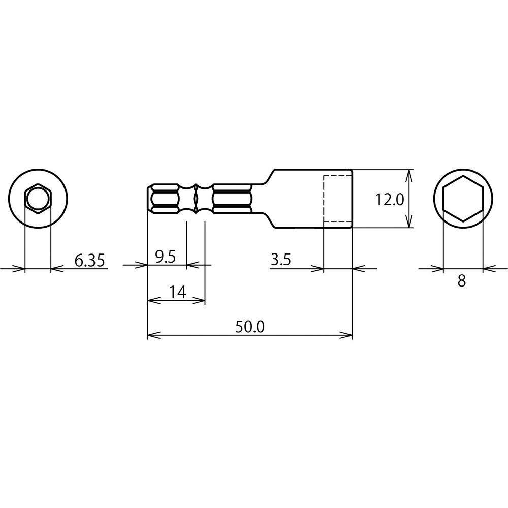 ●18Vインパクト対応です。●電動工具とのジョイント部は9.5mmと14mm兼用のダブル溝になっており、各種電動ドリルに取り付け可能です。●強力なマグネット付きで、へクスタイプのねじ・ボルトを確実に保持、作業効率がアップします。●へクスタイプ(六角頭)のねじ・ボルトの着脱に。●軸寸法(mm):6.35●全長(mm):50●対辺寸法(mm):8●外径(mm):12.0●ナット受部深さ(mm):3.5●シャフト径(mm):6.35●色:シルバー●対辺寸法(インチ):8●シャフト長(mm):25●モデル:ストロックシリーズ●対辺形状:6角●18Vインパクト対応●特殊鋼