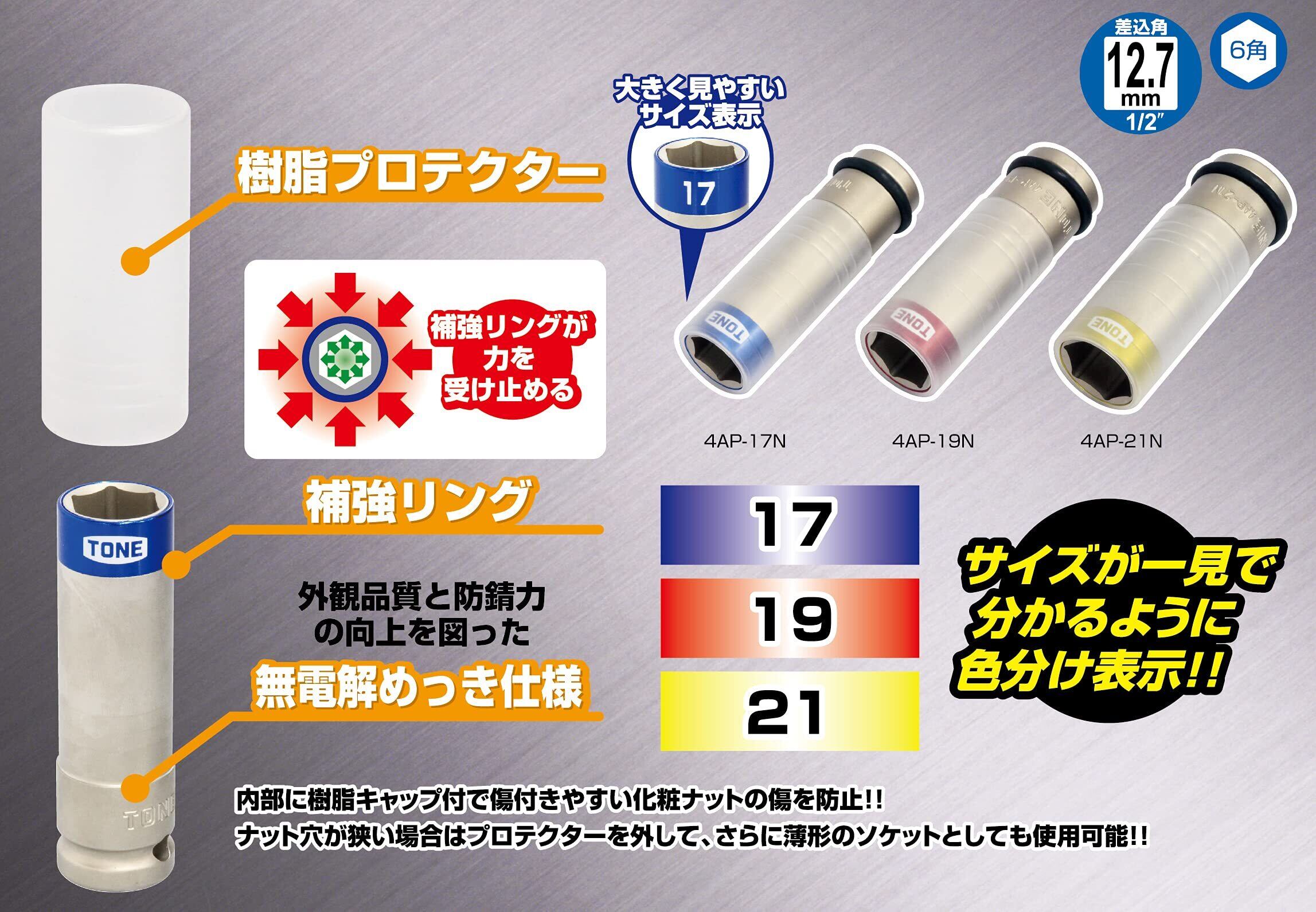 トネ(TONE) プロテクター付インパクト用薄形ホイルナットソケット 4AP-19N 差込角12.7mm(1/2") レッド 二面幅19mm