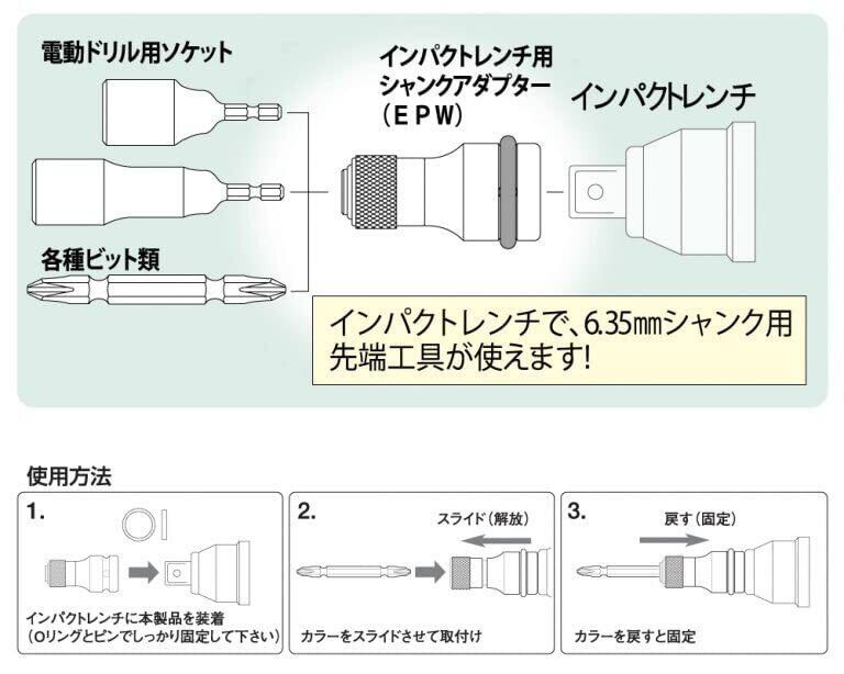 ●ワンタッチ着脱で簡単ビット交換可能です。 ●インパクトレンチに取り付け、6.35mmシャンクの各種・各サイズのソケットやドライバービットが使用できます。 ●使える工具の種類が格段に増えます。