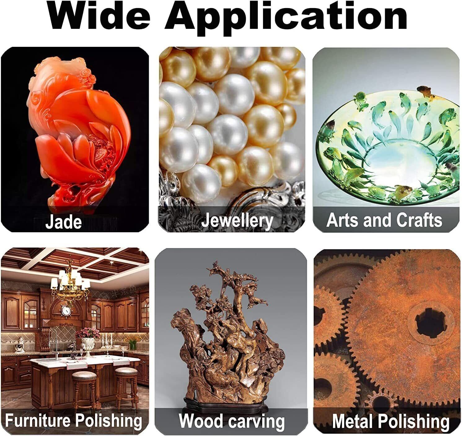 用途:金属、宝石、ガラスの超仕上げ、みがき、つやだし(要研磨剤)、汚れ落とし、金属(貴金属)の最終艶出し作業
