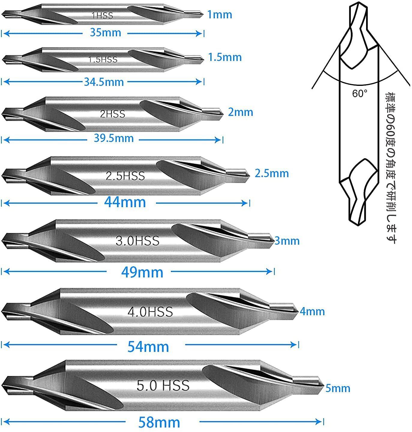KEWAYO 7本 センタードリル センタードリルセット 面取り ネジ穴 ツール センターリング 位置決め 60度の角度高速度鋼 1mm /1.5mm / 2mm / 2.5mm / 3mm / 4mm / 5mm