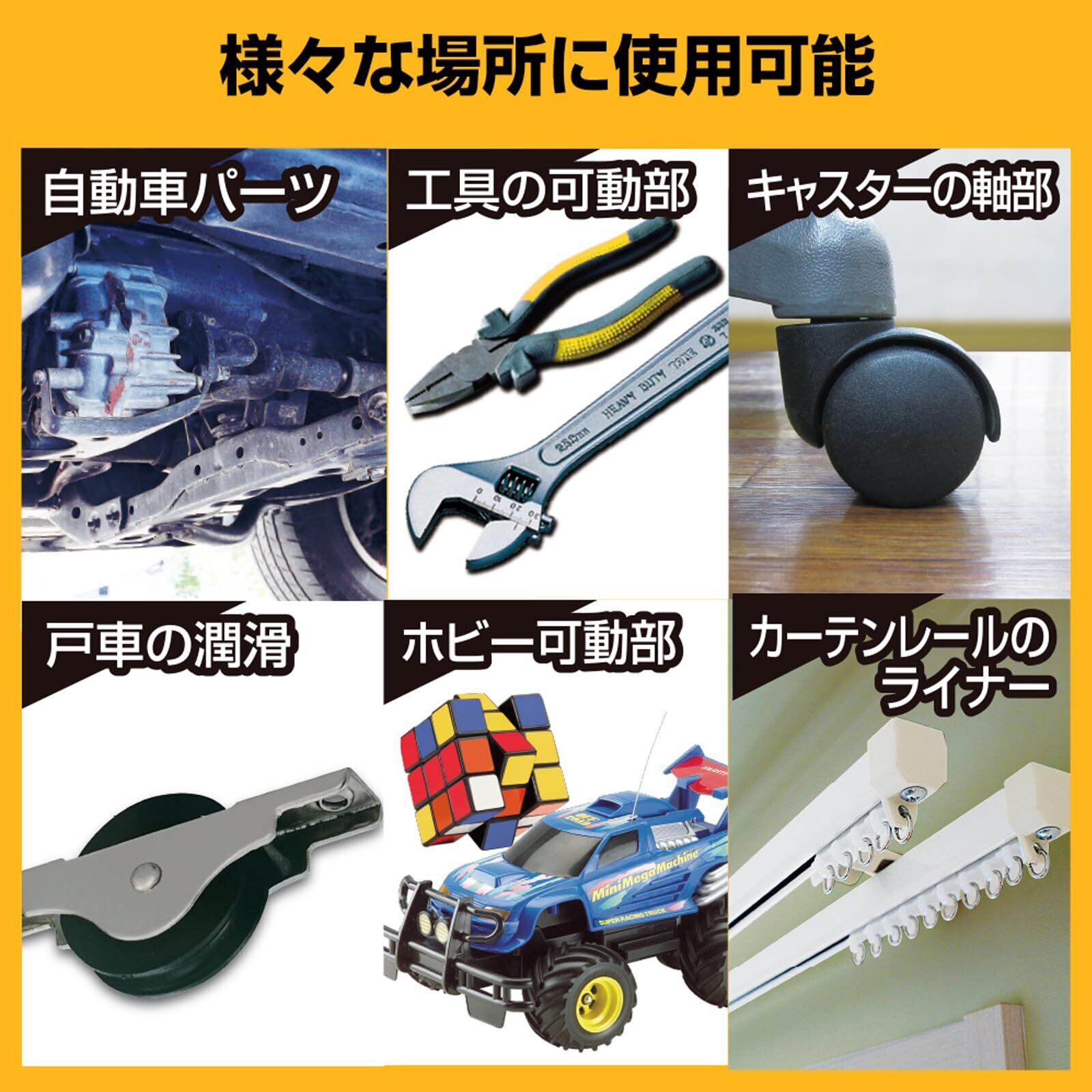 シリコーン被膜の優れた潤滑・防錆効果により、自動車・オートバイ等の金属パーツ部・ドアヒンジ・戸車・ベアリング等、各部に浸透して動きをスムーズにし、錆を防ぎます。