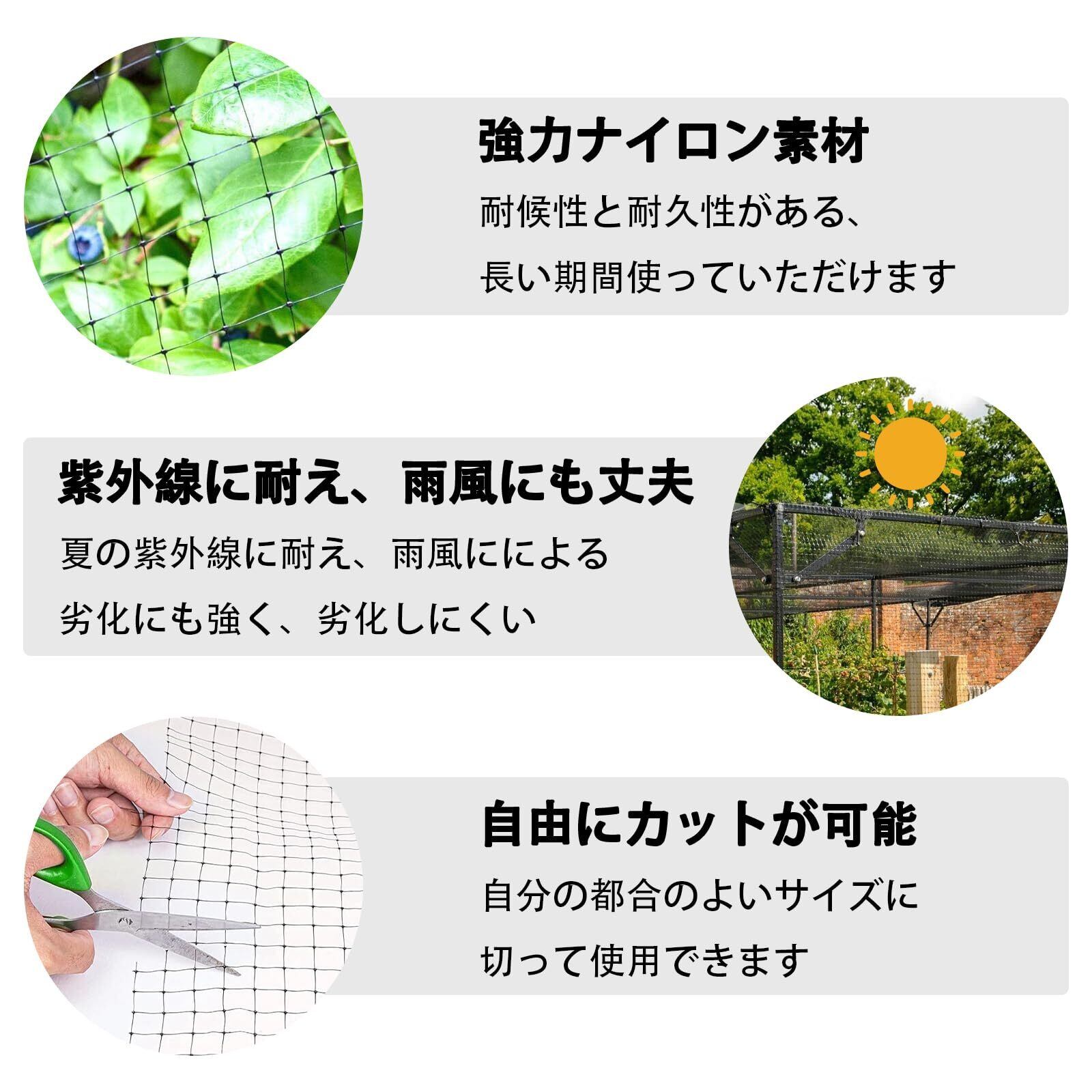 【製品仕様】材質:ナイロン カラー:黒 幅:4m 全長:10m 目合い:16mm パッケージ内容:鳥よけネット(4*10m)*1巻、固定用の結束バンド50本付き。
