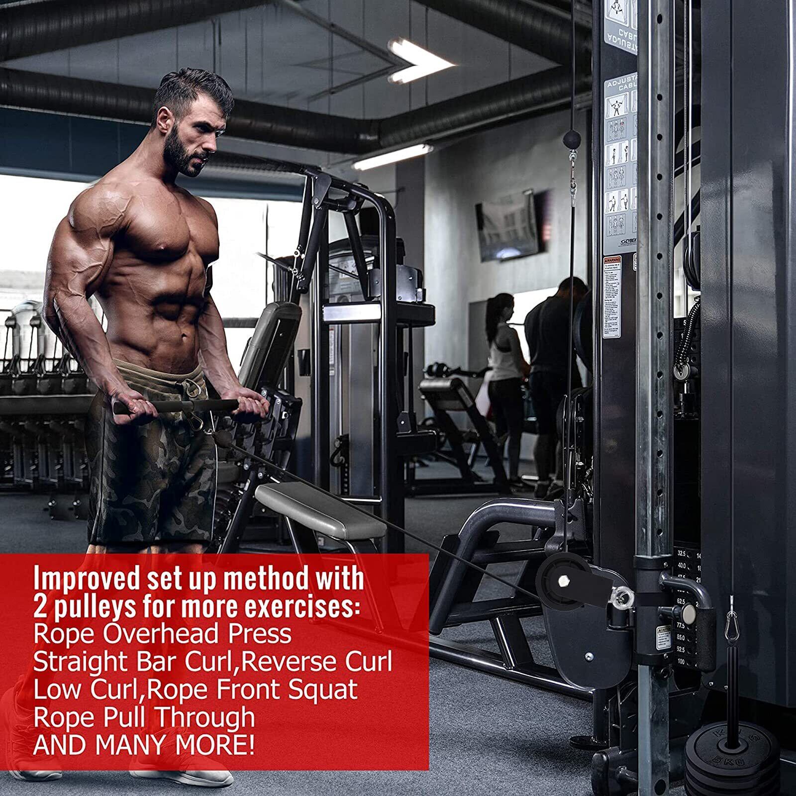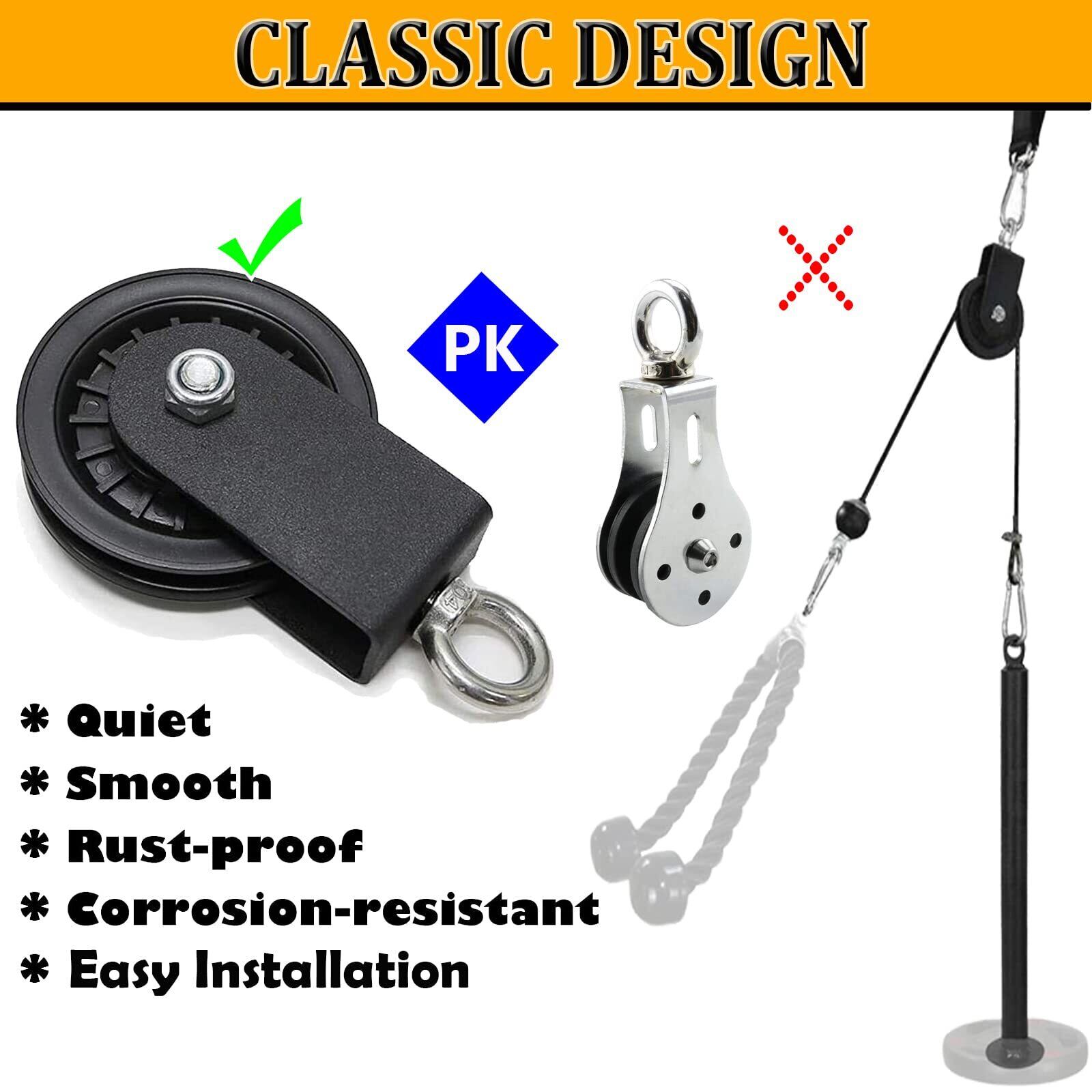 【360度回転】フィットネスプーリーの上部には、回転可能なトップリングが装備されており、セルフロックナットで板金穴に接続されているため、360度自由に回転することができ。ロープの結び目を防ぎ、使いやすい, 滑らかなロープ滑車が優れたロープトラバースを実現。溝巾9mm、最大直径10mmのロープに適用。安全荷重は150kg以内、機能性と耐摩耗性のパフォーマンスがいい。