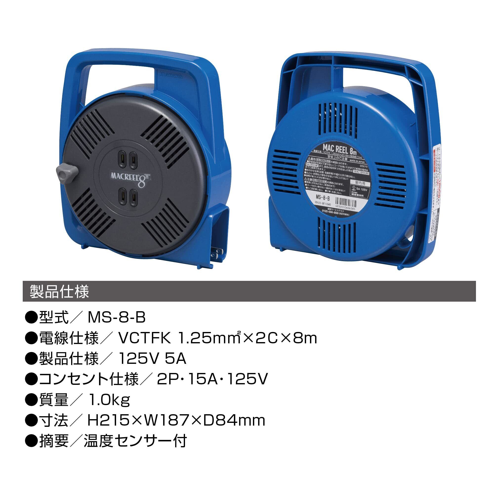 ハタヤ (HATAYA) コードリール 屋内用 ホームリール 100V型 手動巻 8m 温度センサー内蔵 (電線溶解防止機能) コンセント2個 コンパクト 家庭用 ギフト用 マックリール MS-8-B ブルー