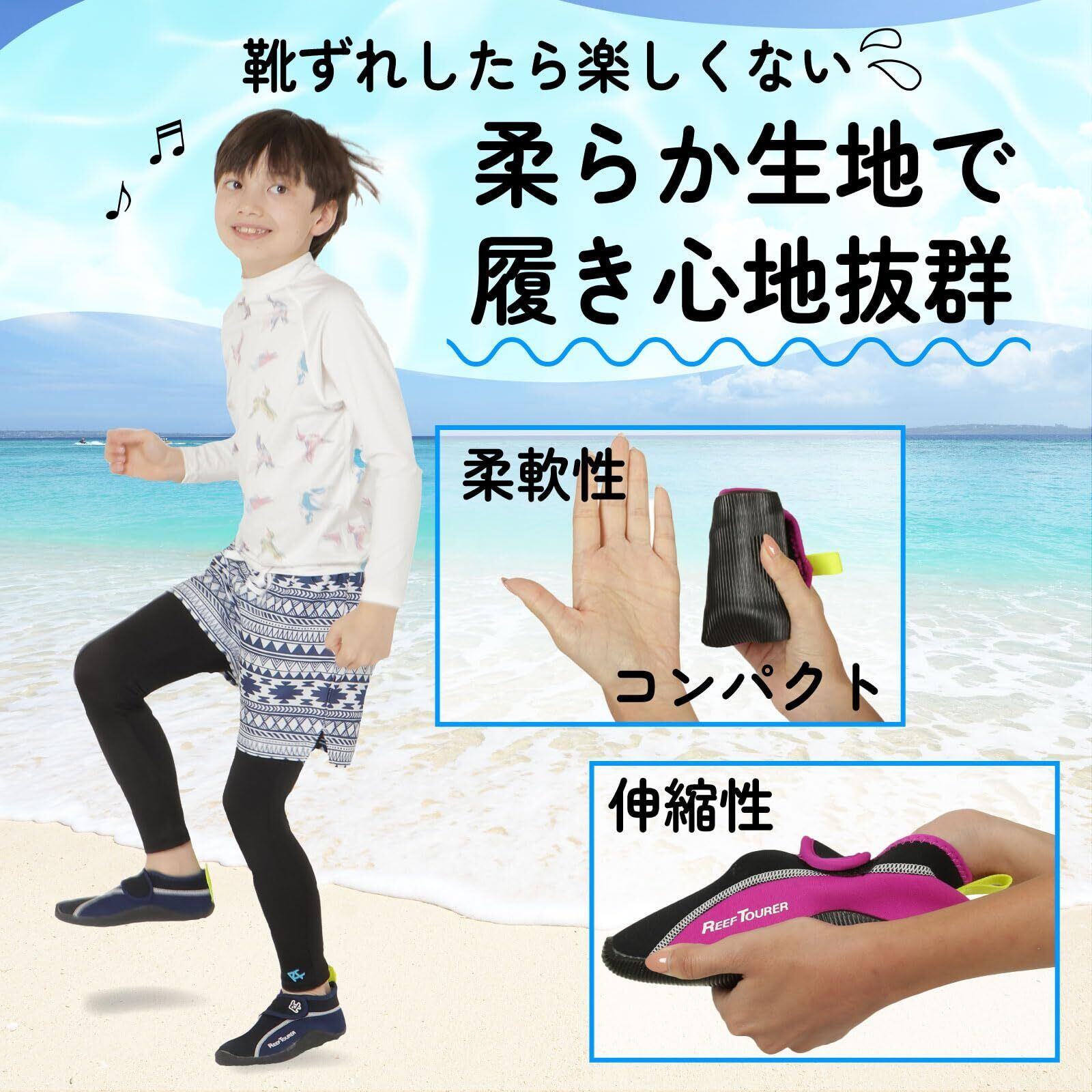 【マリンシューズで足を守ろう】海辺や川辺はそのきれいなイメージとは裏腹に、鋭利な石、貝殻、サンゴ、ガラス片などがあり、裸足で歩くと簡単に足を傷つける危険がゴロゴロしています。そんな危険から足を守るために、水遊びには是非マリンシューズを履くことをお勧めします。また、噴水広場やじゃぶじゃぶ池でも、そのまま入ると足の感染症(例:水虫やウイルス性イボなど)にかかりやすくなるので、衛生面でも自分のシューズを着用すると安心です。REEFTORER(リーフツアラー)のマリンシューズは動きやすさも重視して作られているので活発に動いても脱げにくく、遊びやすいのでキャンプやSUP、カヤックなどのアウトドアシーンでも活躍します。