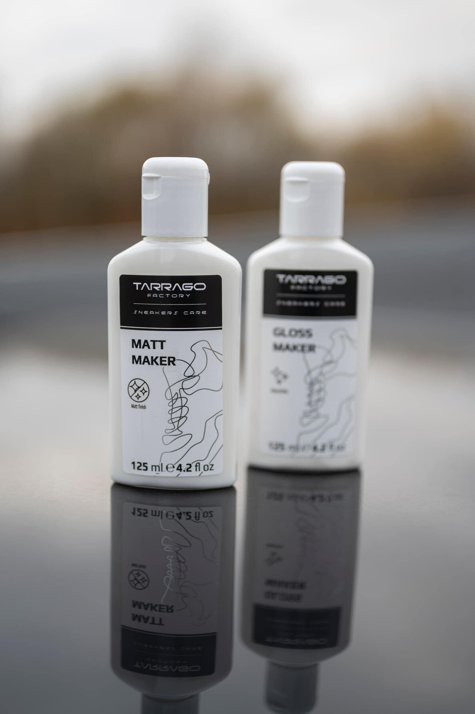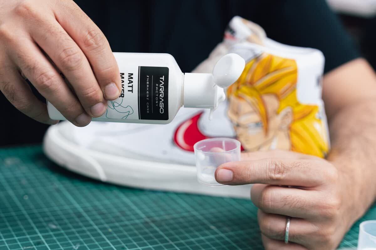 更に持続性を強化するためには、「スニーカーペイントコーティング・うすめ剤」を塗布、その後「マットメイカー」もしくは「グロスメイカー」で仕上げることによって、表面をマット仕上げや光沢仕上げにすることができ、色落ち防止効果も向上させることができます。