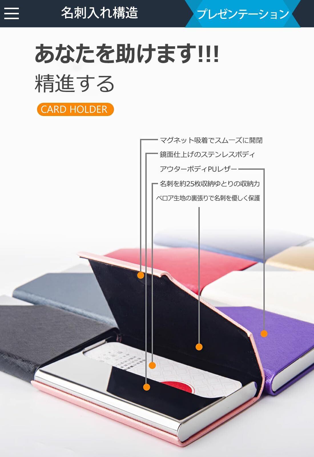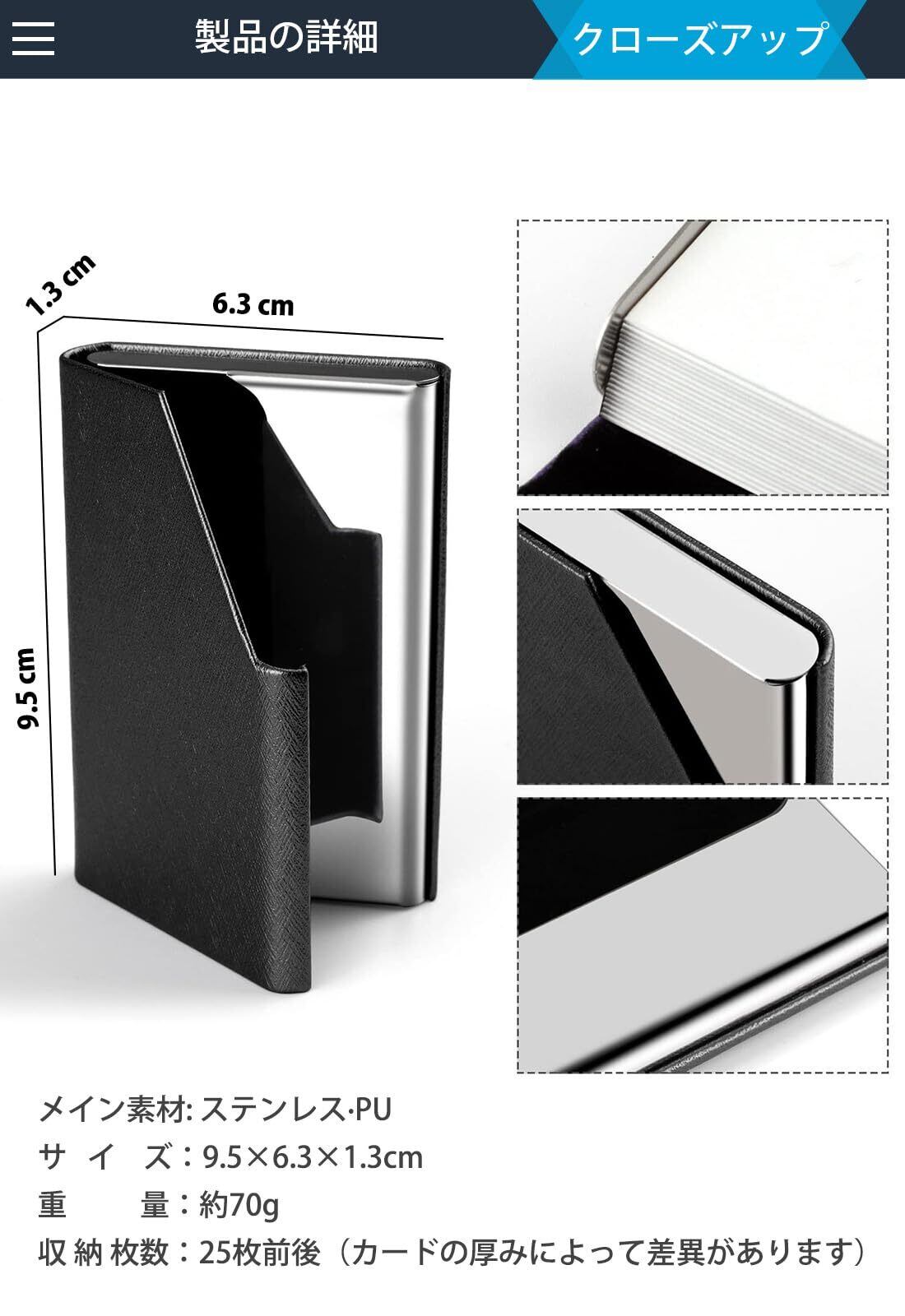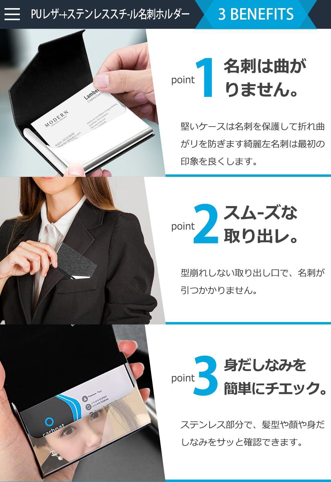 名刺ホルダーは高品質の PU レザーとステンレススチールで作られており、クリアな質感、ソフトで快適な手触りです。 主にPUレザーで覆われているので、 ステンレスで覆われたものに比べ、常に指紋を拭き取ることはありません。