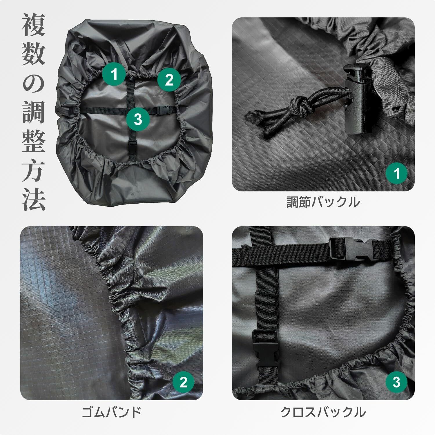 【クロスバックル+ゴムバンド】クロスバックルとゴムバンドの固定方式を採用することで、バックパックカバーをよりバックパックに貼り合わせ、バックパック全体にしっかり固定することができ、強い風雨の中でも脱落しないように調整できます。