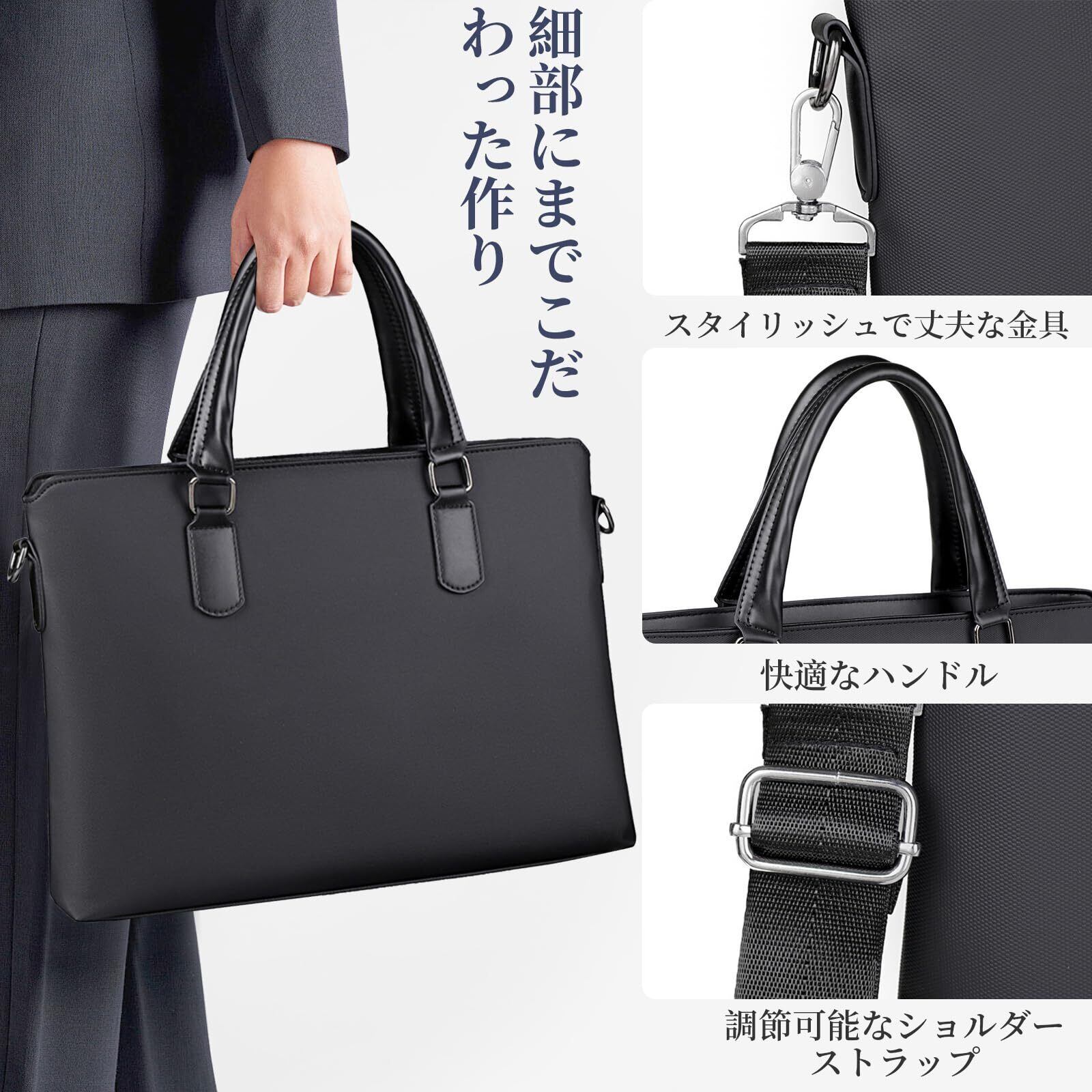 『 2Wayビジネスバッグ』:持ち手とショルダーストラップがついており、お好みの持ち方で持ち歩くことができます。ショルダーベルトが取り外し可能で、ベルトの長さが自由に調節することができるので使用が便利です。