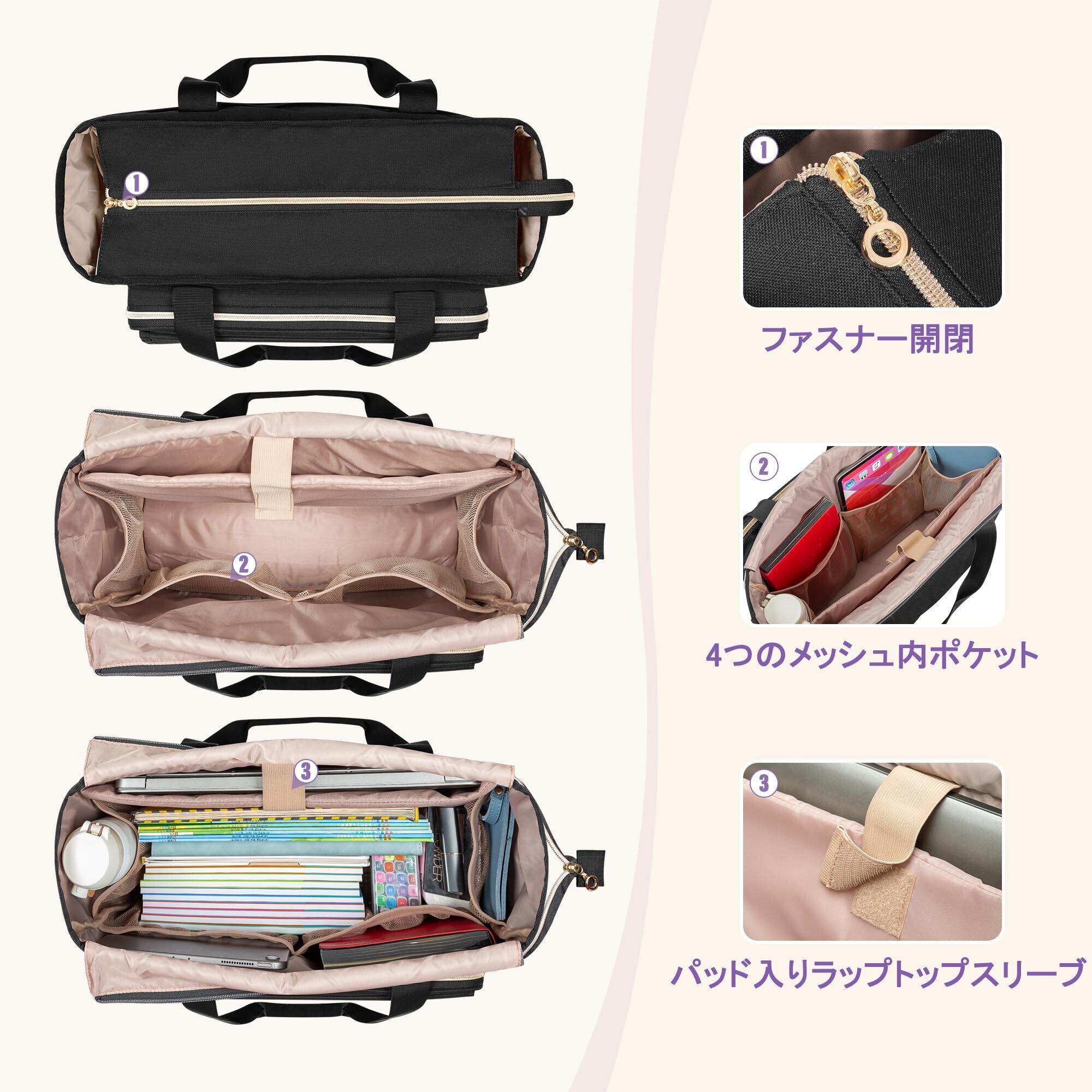 メインコンパートメント: メインセクションは大きくて、本、ファイルフォルダー、ノートなどを収納できます。厚いパッド入りスリーブは15.6インチのラップトップにフィットします。4つの内側メッシュポケットには充電器、コスメなどの細かいアイテムを収納できます。