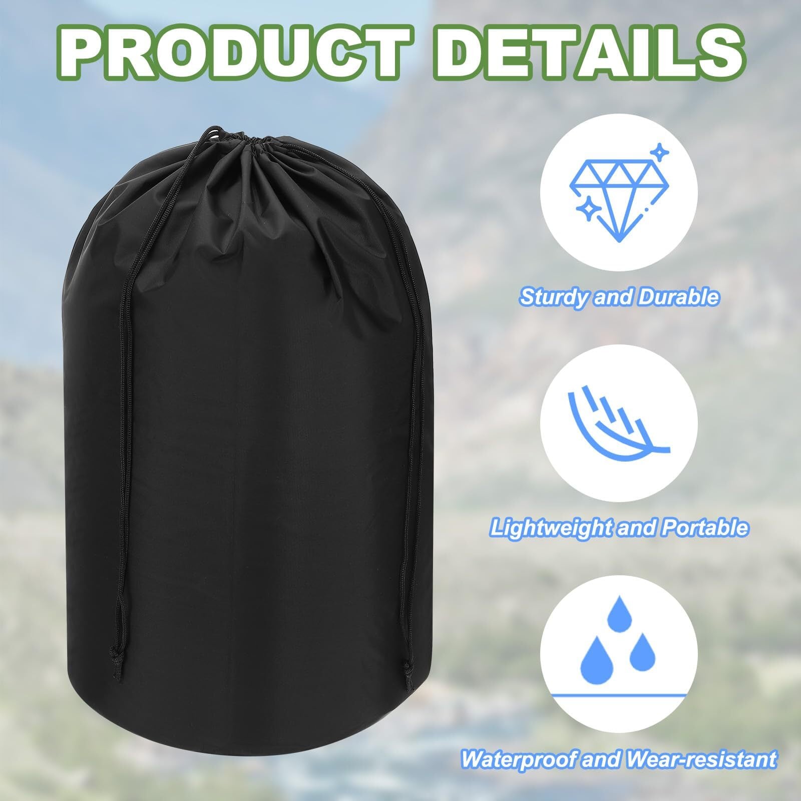 カラー:黒。全体のサイズ:31 x 60 cm (横 × 縦); 梱包内容:スタッフサック1個。