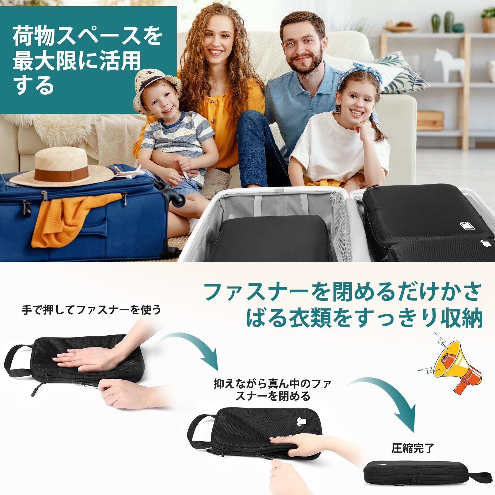 【かんたん圧縮でスペース50%OFF】特別設計の強化SBSファスナーを閉めるだけで衣類を簡単圧縮。面倒なポンプや専用器具は不要なので、お子様からご年配の方まで誰でもラクラク操作可能。かさばる衣類もコンパクトに圧縮できるから、スーツケースの収納効率が劇的にアップ!