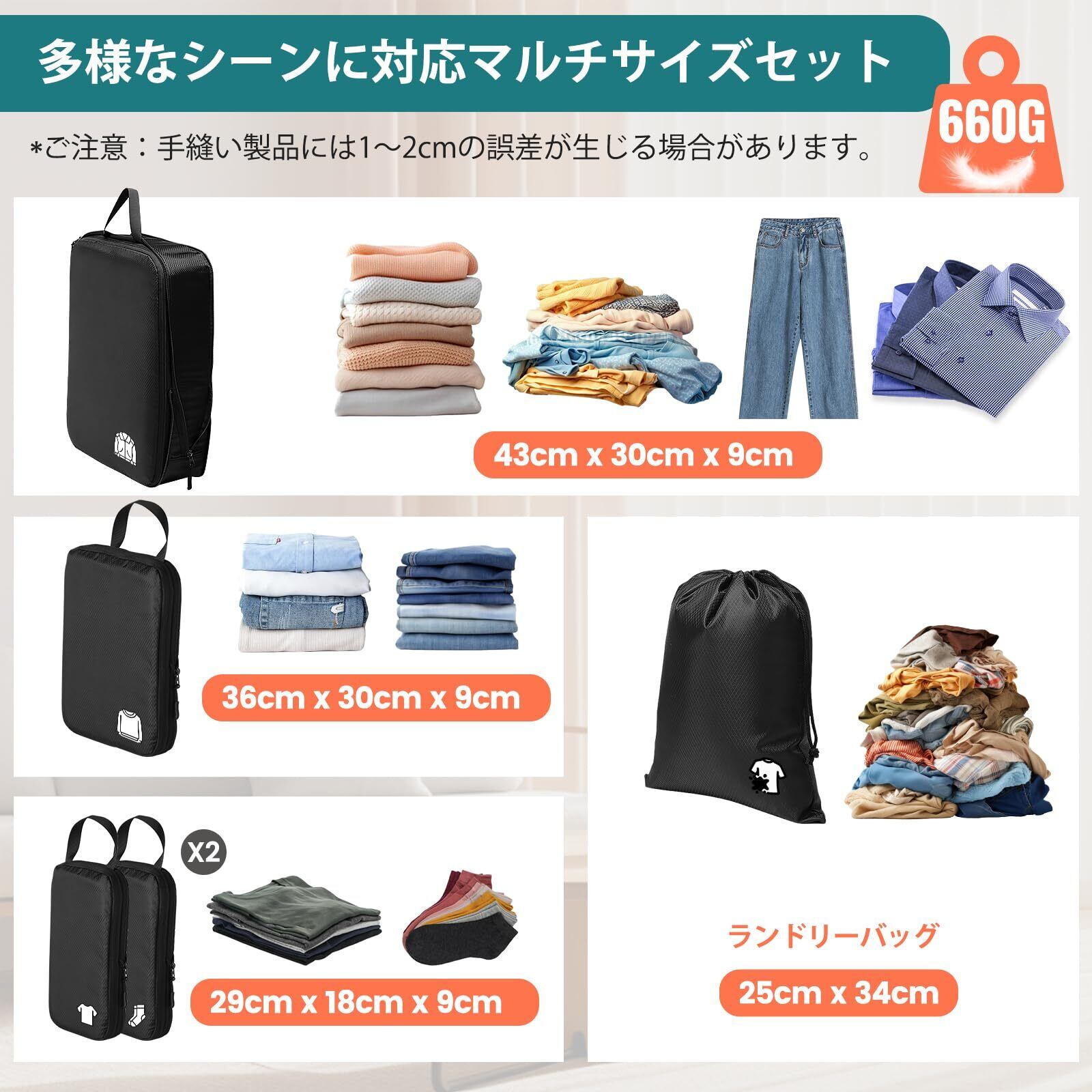 【5点セットでスマート収納】Lサイズ(43×30×9cm)、Mサイズ(36×30×9cm)、Sサイズ(29×18×9cm)の衣類収納ポーチに加え、靴下専用ポーチ(29×18×9cm)と巾着袋(25×34cm)の充実セット。清潔な衣類と汚れた洗濯物を分けて収納できるから、スーツケース内が衛生的に整理でき、旅行中のストレス軽減に大活躍!