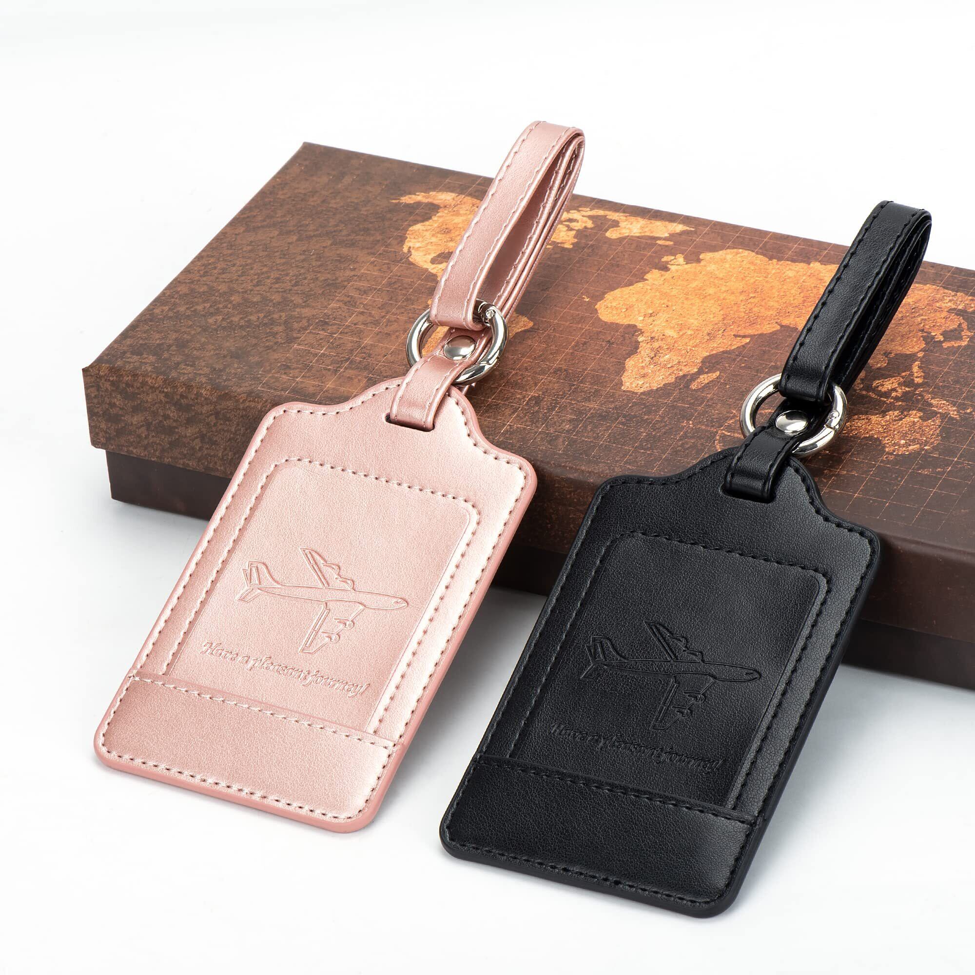 [2枚セット] 荷物タグ ネームタグ - スーツケースタグ 紛失対策 名前ラベル IDカード用 社員証 レザー バッグ用ネームタグ ビジネス 防塵 番号札 出張用 旅行 軽量 Migeec (ブラック+ローズゴールド, 2枚セット)