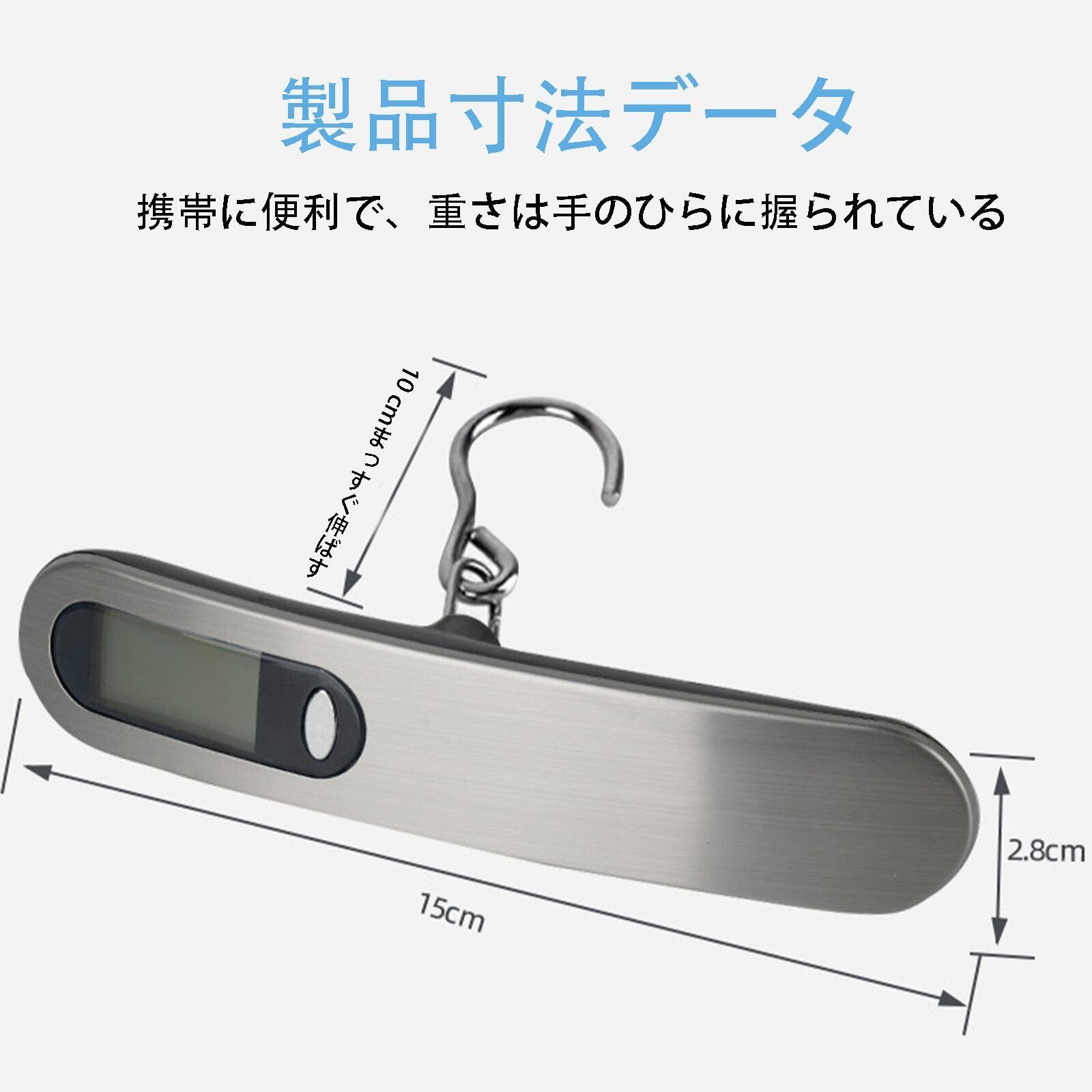 【商品規格】手持ち電子秤(電池+LEDディスプレイ付き)、好ましくはABS新材料+ステンレス伸線材質、サイズ:15 cm×2.8 cm伸線10 cm、秤量範囲:100 g-50 kg。