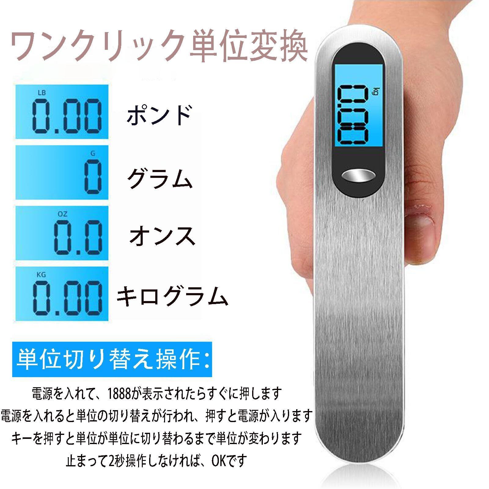 【人間工学デザイン】人体工学デザインなので、握る所は使用者の手にぴったりフィットし、いろんなところで快適に使えやすい。荷物はかりは4種類器量単位があるし高精度計量で、電源ボタンを押して持ち上げるだけで簡単計測。