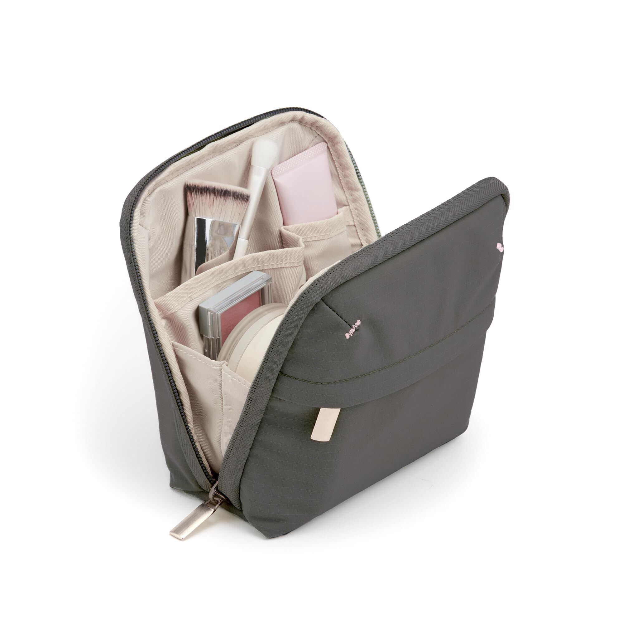 ・ファンデーションなど大きめのアイテムが入るメインスペースに、ブラシやマスカラなどを分けて整理できる9つの仕切り、外側にはちょっとした小物を入れられるファスナーポケット付き。※仕切りスペースはポケットになっておりません。収容物にご注意ください。