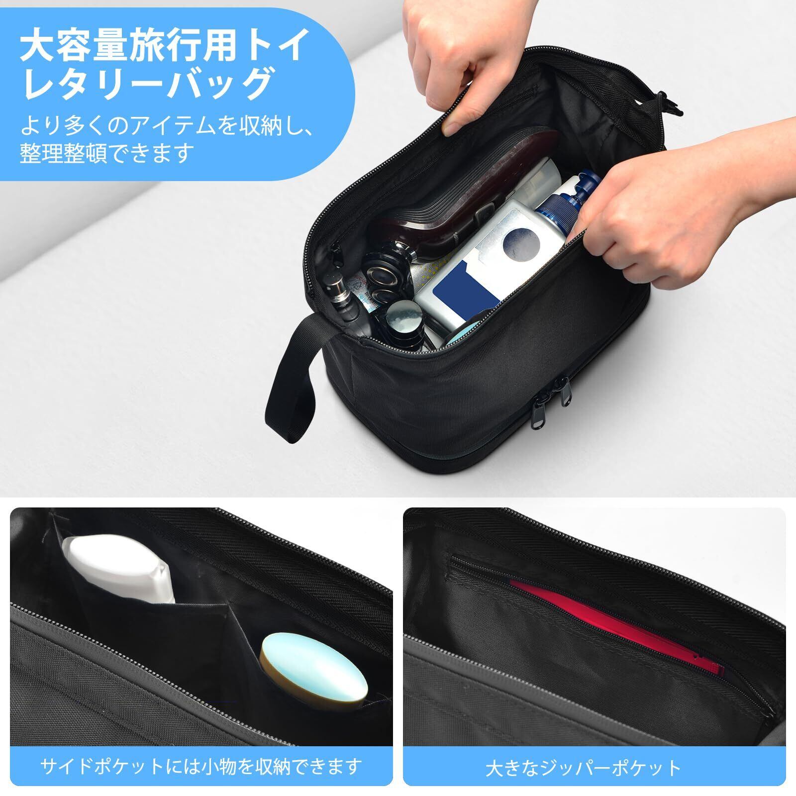 大容量:このトラベルポーチのサイズは23x13x17.5cmで、大きなメインコンパートメント、2つのサイドポケット、ジッパーポケット、そして独立したボトムコンパートメントが含まれており、すべてのトイレタリー用品、シェービング用品、グルーミングアクセサリーを収納できます。この旅行用ポーチは、男性にとって旅行、出張、週末の休暇中の必須アイテムです