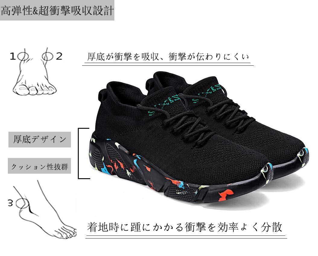 【厚底/クッション性/疲れにくい】スポーツシューズのソール部分はある程度厚みもあって、足底には優しいですが。スニーカーはクッション性に優れています、踵に衝撃吸収技術を設計し、アウトソールは 衝撃を吸収、着地時に踵にかかる衝撃を効率よく分散。さらにしなやかなソールは足の動きにフィ ット して、長時間のウォーキングや立ち仕事での疲労を大幅に軽減します。