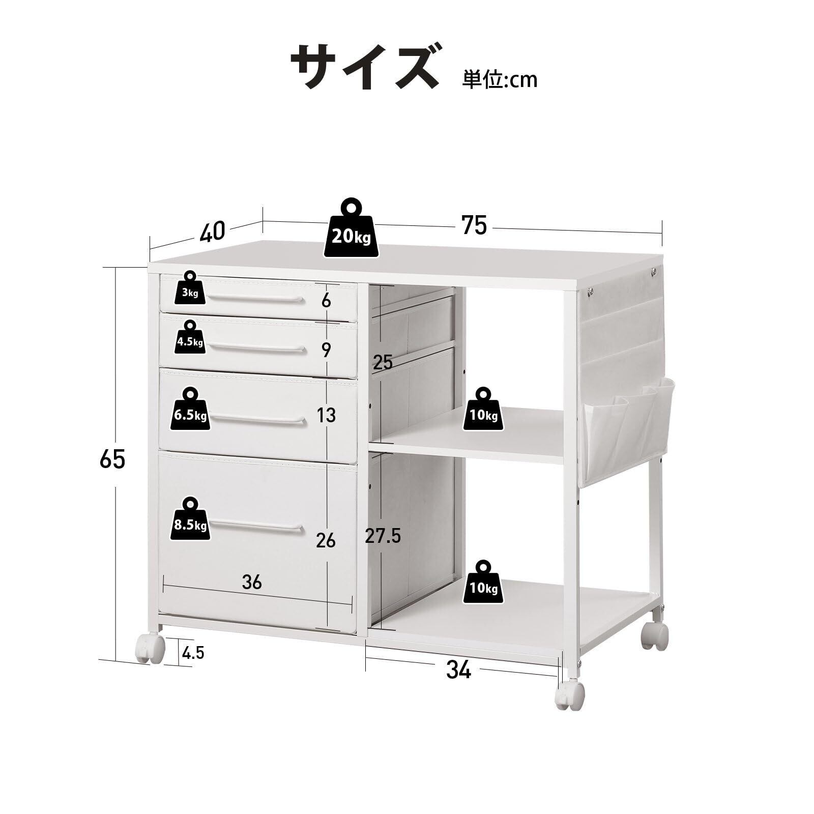 【商品仕様】商品外寸:幅750*奥行400*高さ650mm。本体重量:10kg。耐荷重:天板10kg、上段10kg、中段10kg*2、下段10kg、階板10kg。素材:合成樹脂強化合板、オクスフォード。※ご注意※お客様組立商品。天板は引き出しとラックに分かれていますが、幅によって穴の位置が4センチずれていますので、間違えないようにご注意ください。