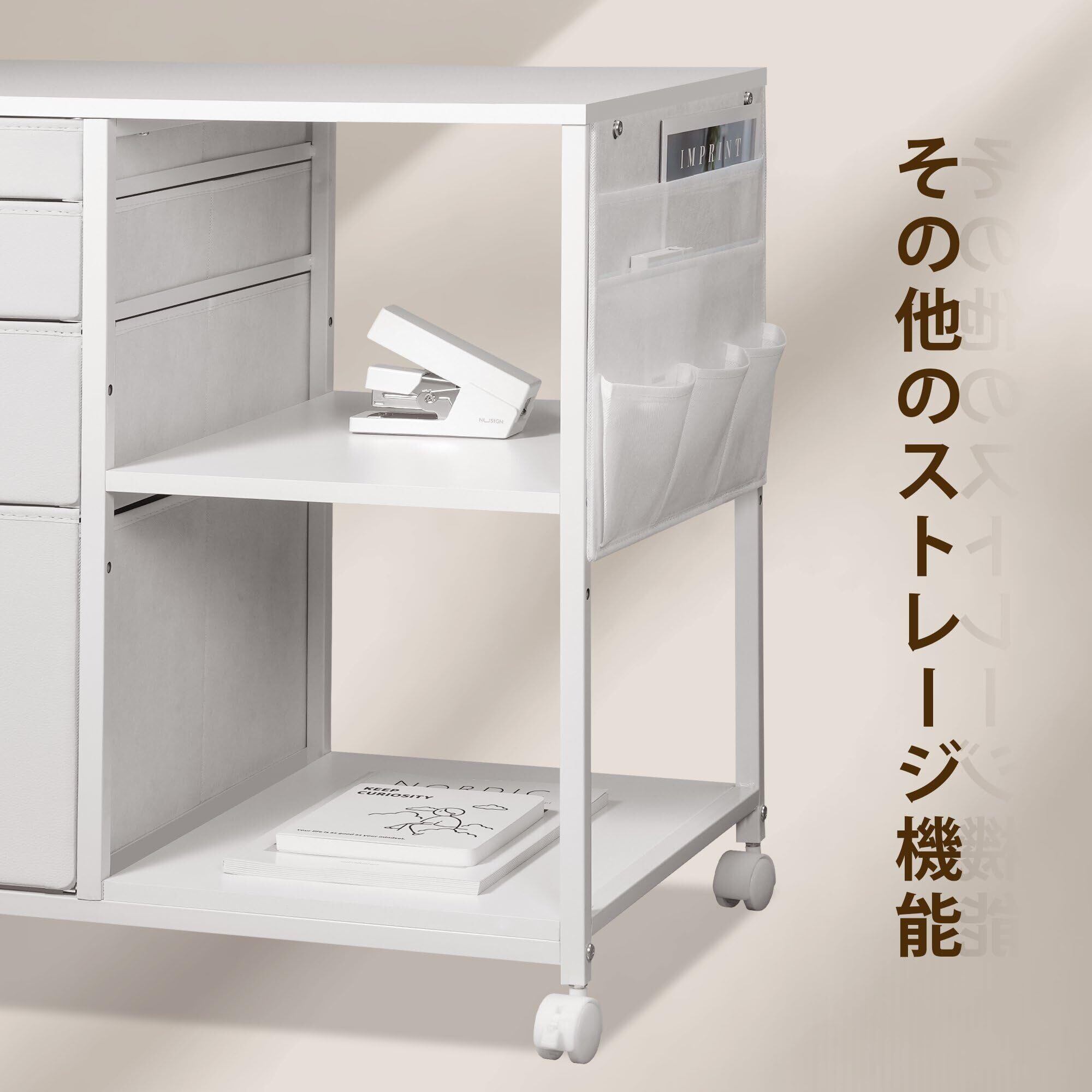 【移動便利】引き出しの取材がオックスフォード布と不織布なので、サイドワゴン全体がとても軽く、移働に便利なキャスターがついています。手軽に移動ができますので、レイアウトの変更や掃除の際も簡単に移動ができます。また、ストッパーが付いているので、引出しを開ける度にワゴンが一緒に動いてしまったり、転倒したりすることはありません。