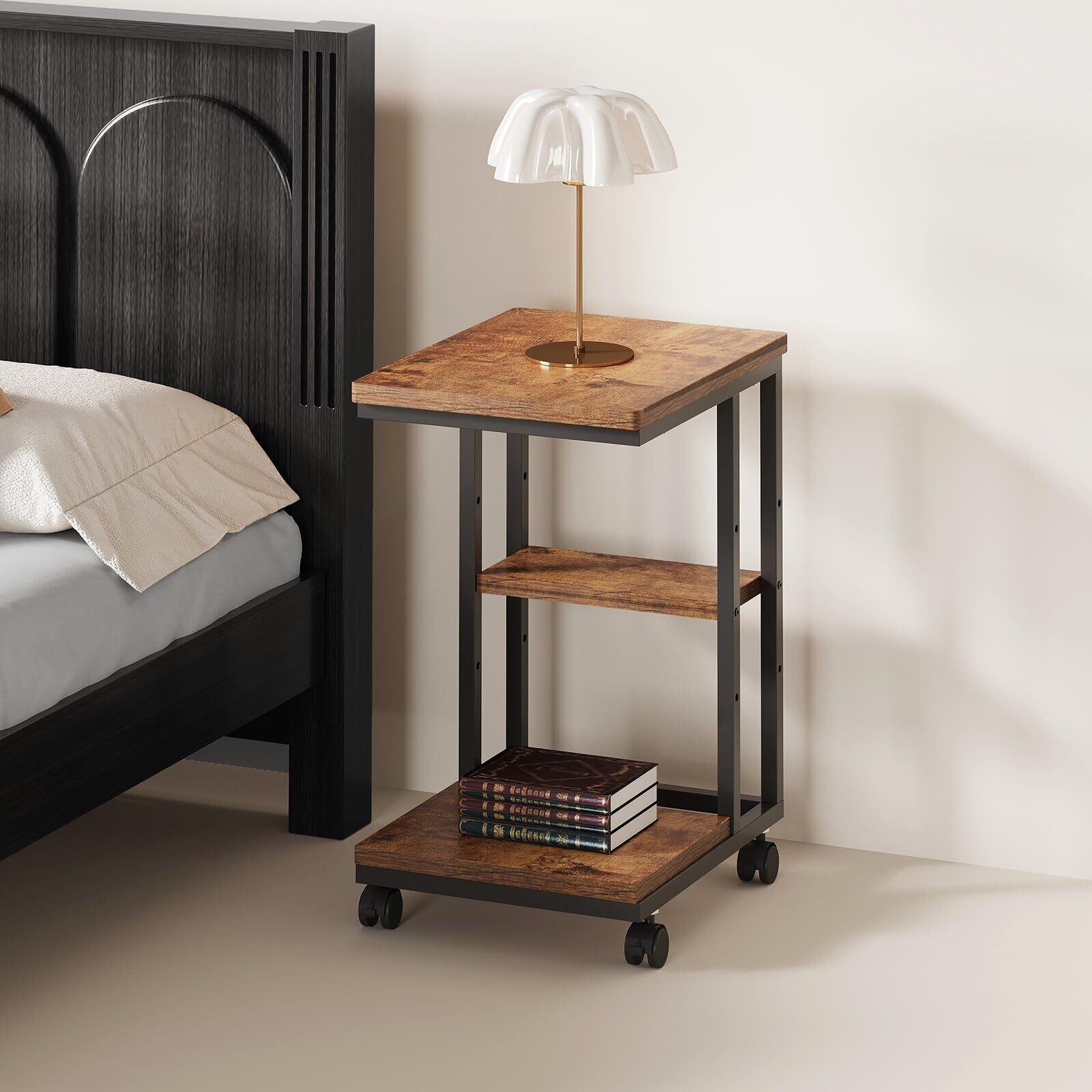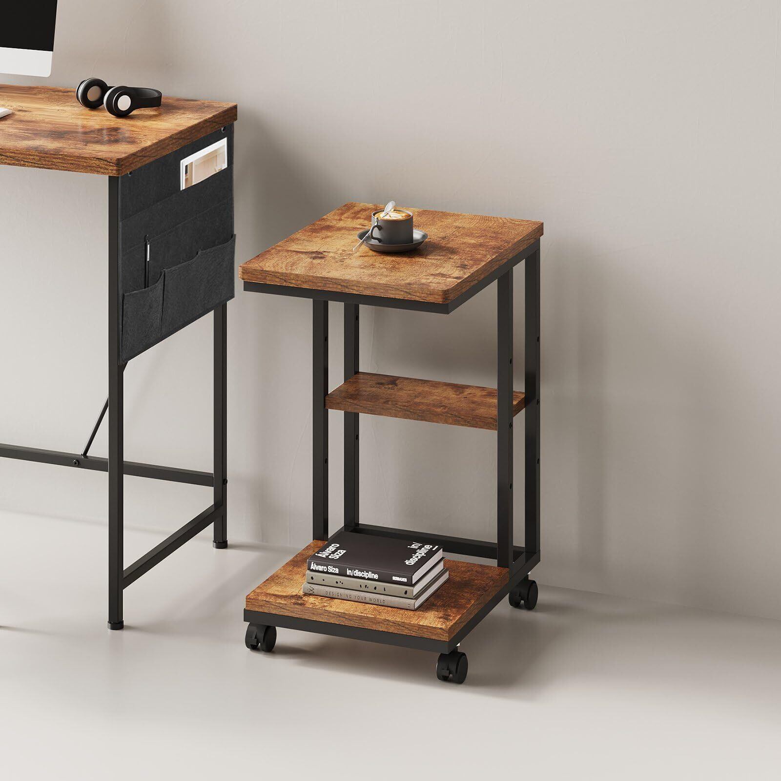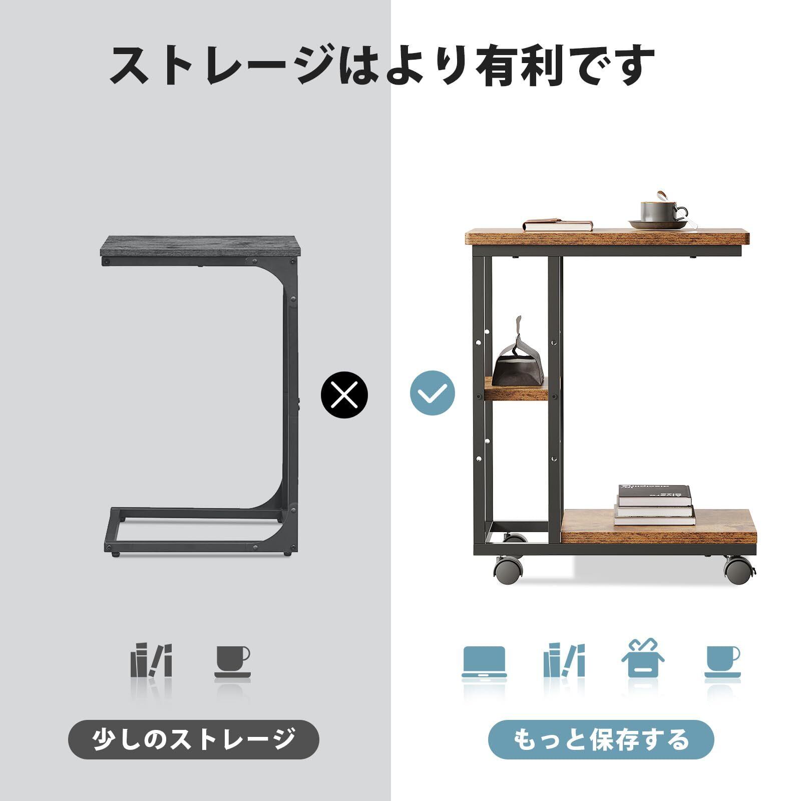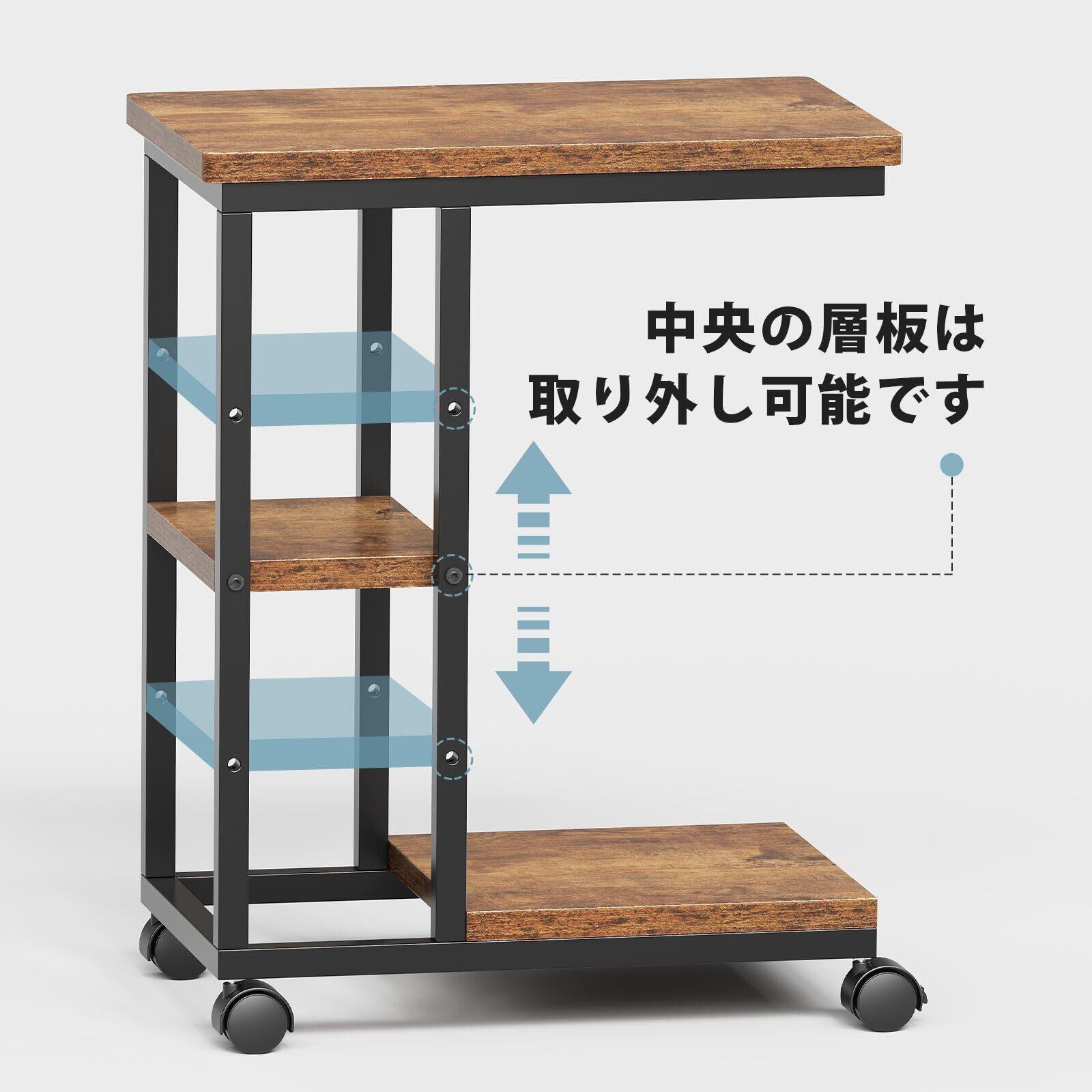サイドテーブル キャスター付き ソファーテーブル コの字型ベッドサイドテーブル ソファテーブル 可移動 層板は調節可能 幅40×奥行29.5×高さ51.5cm(キャスター含む)ビンテージ