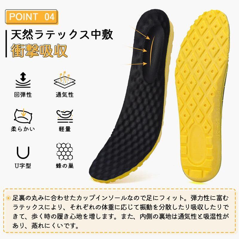 【天然ラテックスの中敷】ラテックスはゴムの木から採れた汁を発泡して作ったものなので、足に優しい素材です。中敷はソフトな質感で、クッションを全面的にセットし、足あたりもよく、歩行時の衝撃を軽減してくれます。また、通気性にも優れています。