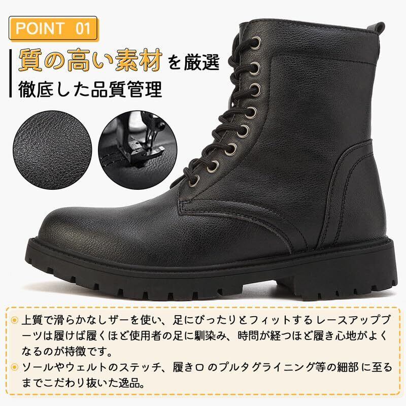 【質感ある素材を厳選】靴の表面は心地良いとても細かい皮革を採用して、柔軟な肌触り心地に優れ、足に優しくフィットします。上質なレザーの靭性も優れているため、ワークブーツ ブーツの特有な輪郭と形状を維持できて変形などはしにくいです。