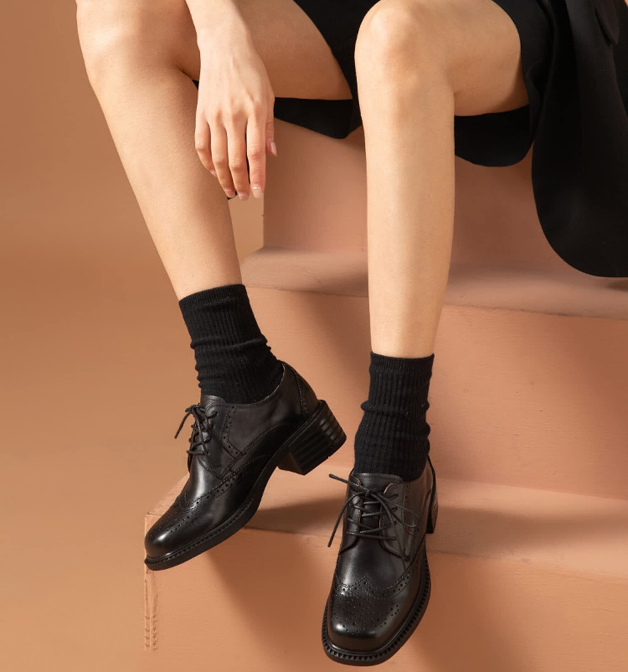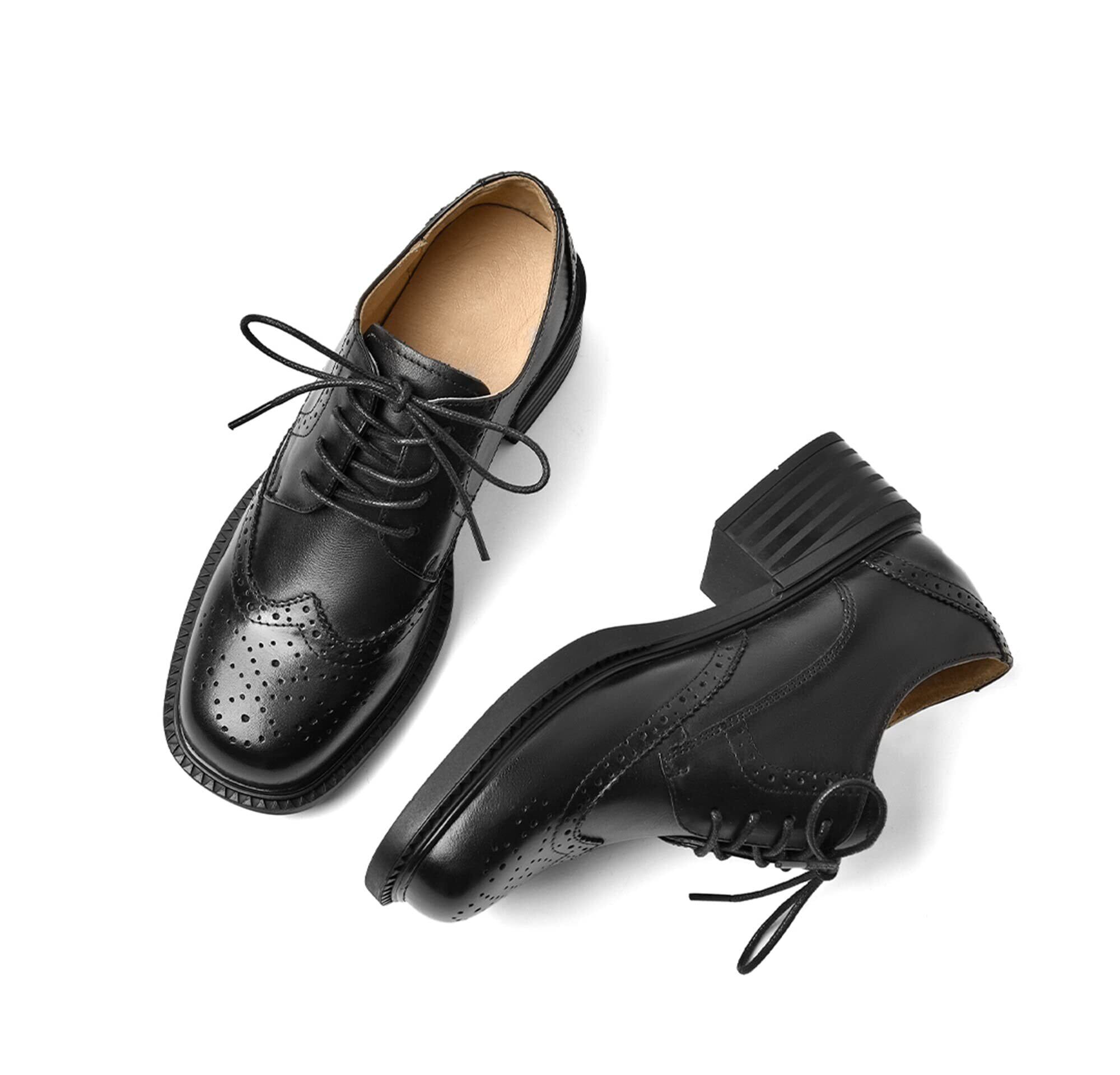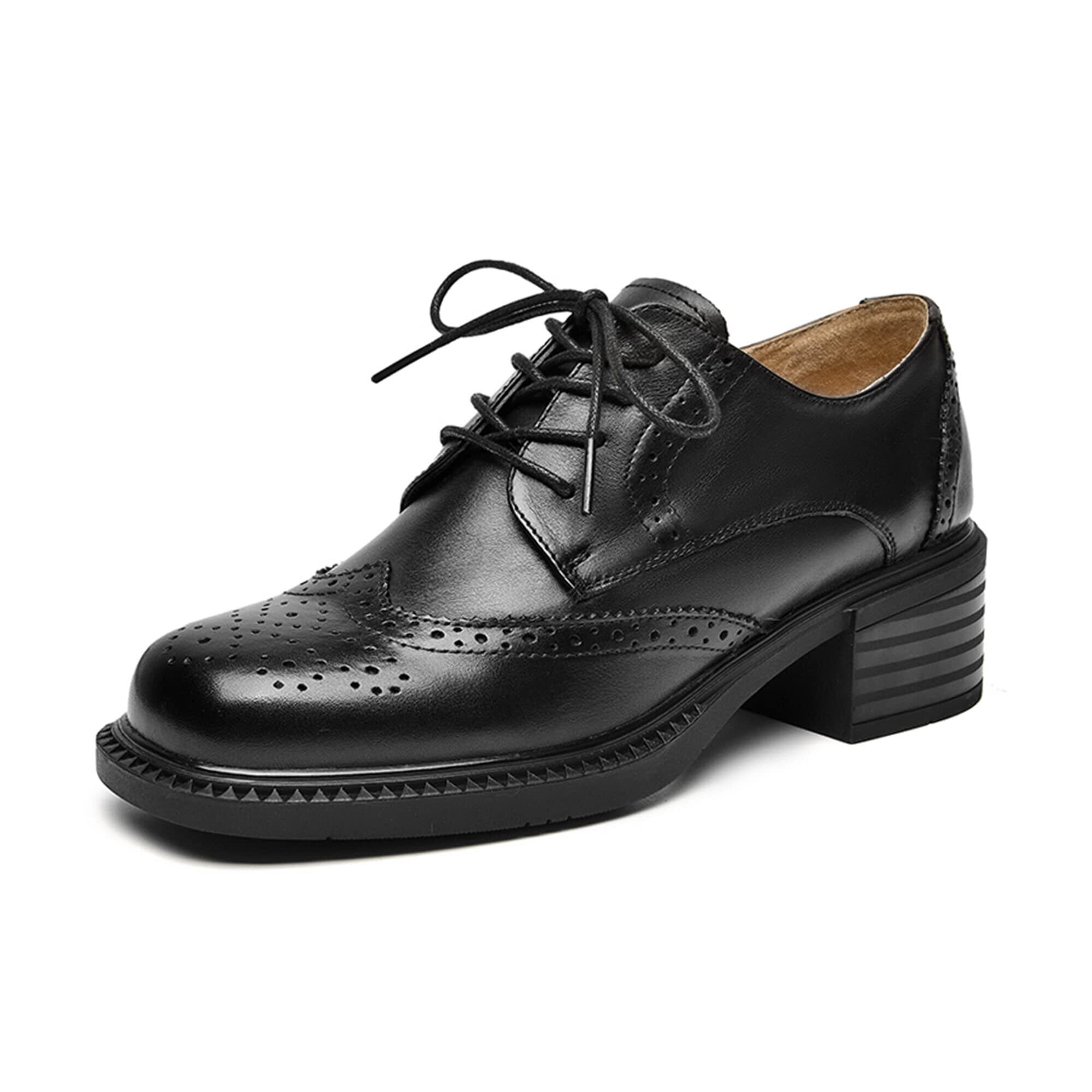 [ZUYEE] レディース レースアップシューズ スクエアトゥ 太めヒール ウイングチップ 本革 オックスフォードシューズ 通勤