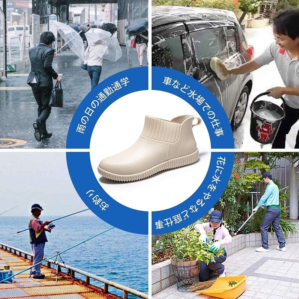 【快適でカッコいい】伝統な雨靴のイメージを一転し、雨の日に使うだけではなく、晴れた日に履いてもオシャレなレインブーツです。帰宅時に雨がやんでいても違和感なく使える晴雨兼用デザインとなっております。柔軟性のある天然ゴムを採用し屈曲性に優れ、防水性も抜群で、長時間履いても快適な履き心地を実現します。