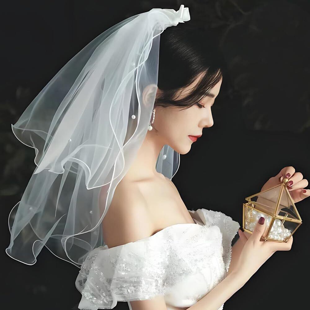【デザイン特徴】短めのベールには白い人工真珠、波状の縁取り、手作りの白いリボンが施されており、全体が柔らかな白色で、シンプルで優雅なデザインが女性らしいファッションの魅力を引き立て、さまざまなシーンに適しています。