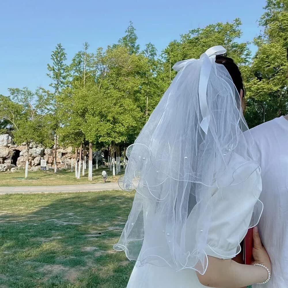 この短いベールには、絶妙な白い人工真珠が点在し。柔らかな白、控えめでエレガントな純粋なデザイン、シックな結婚式のベールはあなたの結婚式のための優れた装飾です。