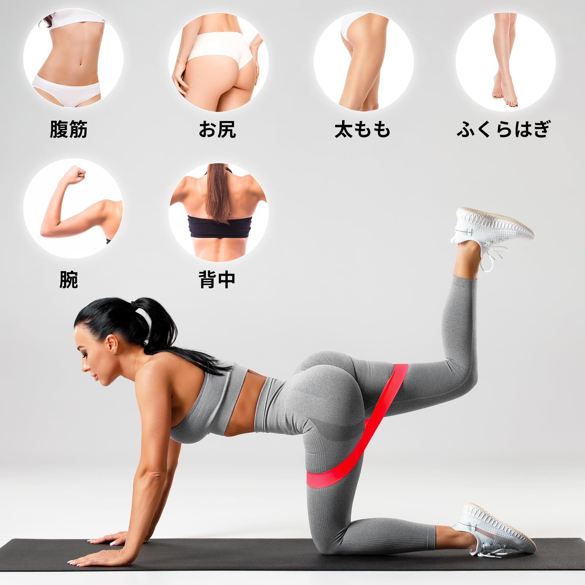 【5から59kgまで負荷が変えられます】5種類の負荷のトレーニングバンドがあり、組み合わせて自分にあった負荷を調節できます。幅が広く負荷をかけた時の安定感が抜群です。ゴムバンドは自在に伸縮できますので、筋トレ、体幹トレ、ストレッチ、美尻など幅広く活用できます。ちなみに、普段鍛えられなかった内転筋はスクワットでトレーニングできます。