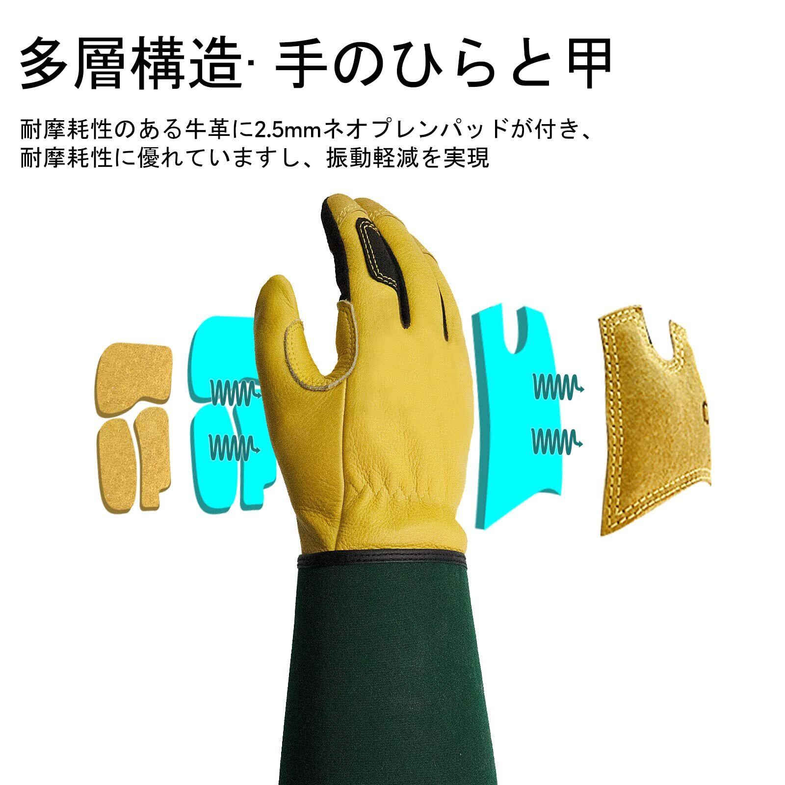 【柔軟・通気性抜群の素材及び安全袖口】 ●掌に牛表革素材を使い、柔軟性・耐摩耗性が優れ、 掌パッドを入れ、耐摩耗性があり、衝撃、カットや損傷を軽減し、手にエクセル保護を提供●シャーリングゴムバックのため、はめ心地が優れています●ロングカフのため、前腕を保護します