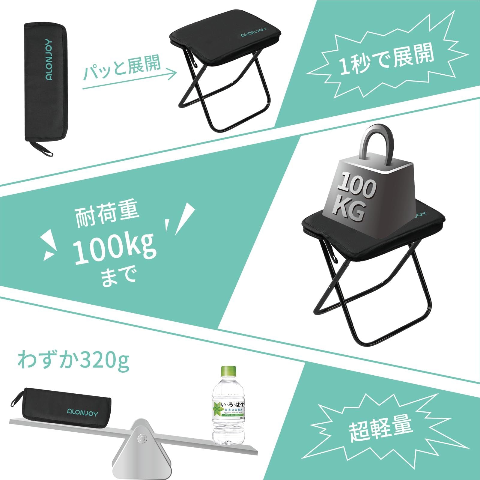 【超軽量、超便利】 ①アルミ合金の軽量材でわずか320gの重さ、ペットボトル天然水1本よりも軽い!鋼材の類似商品より60%軽い! ②1秒でパット展開、収納も簡単、更に収納袋と椅子一体型、収納袋もいらない!