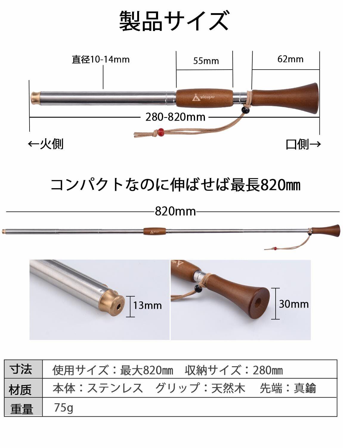 【超長い82cm・便利な火吹き棒】Vicopo 火吹き棒は収納時は28cmでコンパクトになり、伸ばすと最大82cmまでの長さに調節できます。火元から遠くに座っていても安全な距離を保つことができるため、チェアに座ったままの焚き火やBBQに最適です。火吹き筒の直径は14mmで、軽く息を吹くだけで周囲の空気を取り込むことができます。火をおこすだけでなく、火力をアップさせるだけでなく、散らかった灰の掃除にも便利です。