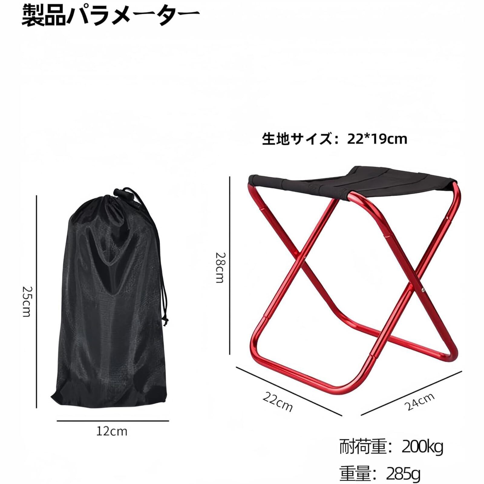 【製品の詳細】高強度アルミ合金製の折りたたみ椅子、耐荷重100kg、頑丈で耐久性がある、パッケージ内容:折りたたみ椅子+収納袋、展開サイズ:22 * 24 * 28cm、布サイズ:22 * 19cm、収納サイズ:24 * 11cm、材質:アルミ合金+オックスフォード布 カラー:レッド、ローズゴールド