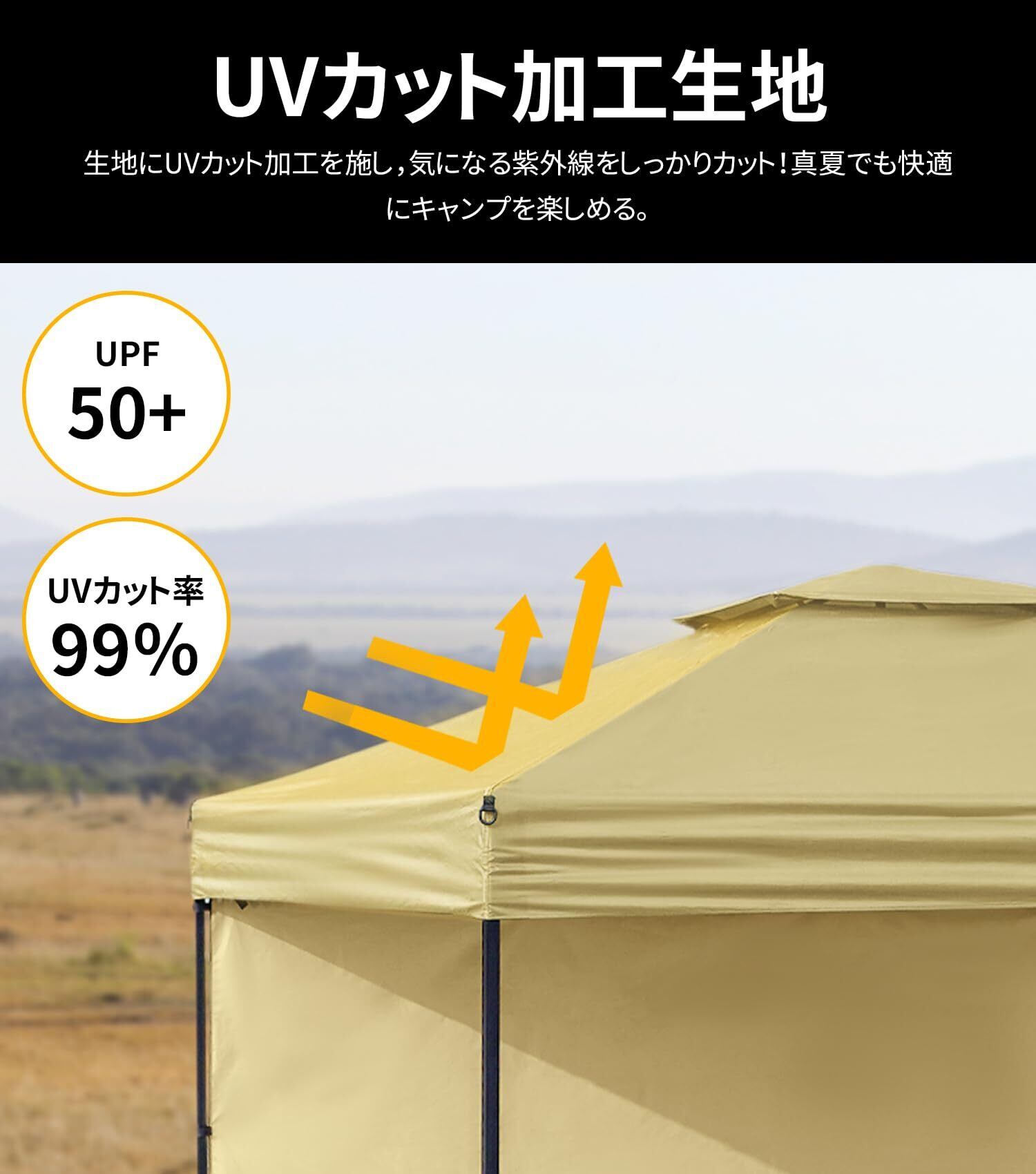【商品仕様】●組立時サイズ:(約)奥行き2m×幅2m×高さ1.85m/2.15m/2.45m(3段階高さ調整可能) ●収納時サイズ:(約)18cm×18cm×113cm ●セット重量:(約)10.81kg ●フレーム材質: スチール ●シート生地 : 150Dポリエステル