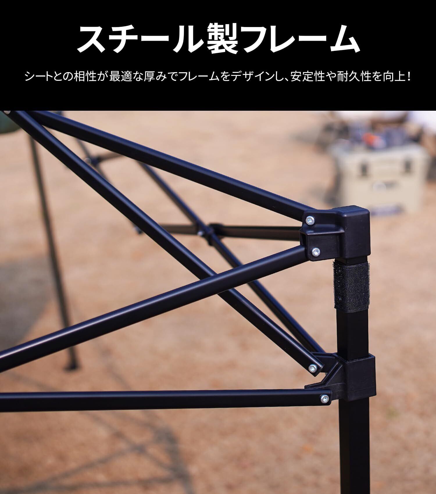 【高品質なスチールフレーム】高品質で丈夫なスチールフレームを採用し、テントの構造安定性がよくなり、耐荷重も高くなります。防錆塗料を使い、防水性がよくなり、錆も発生しにくなるから、ワンタッチテントの耐久性もより高くなりました。