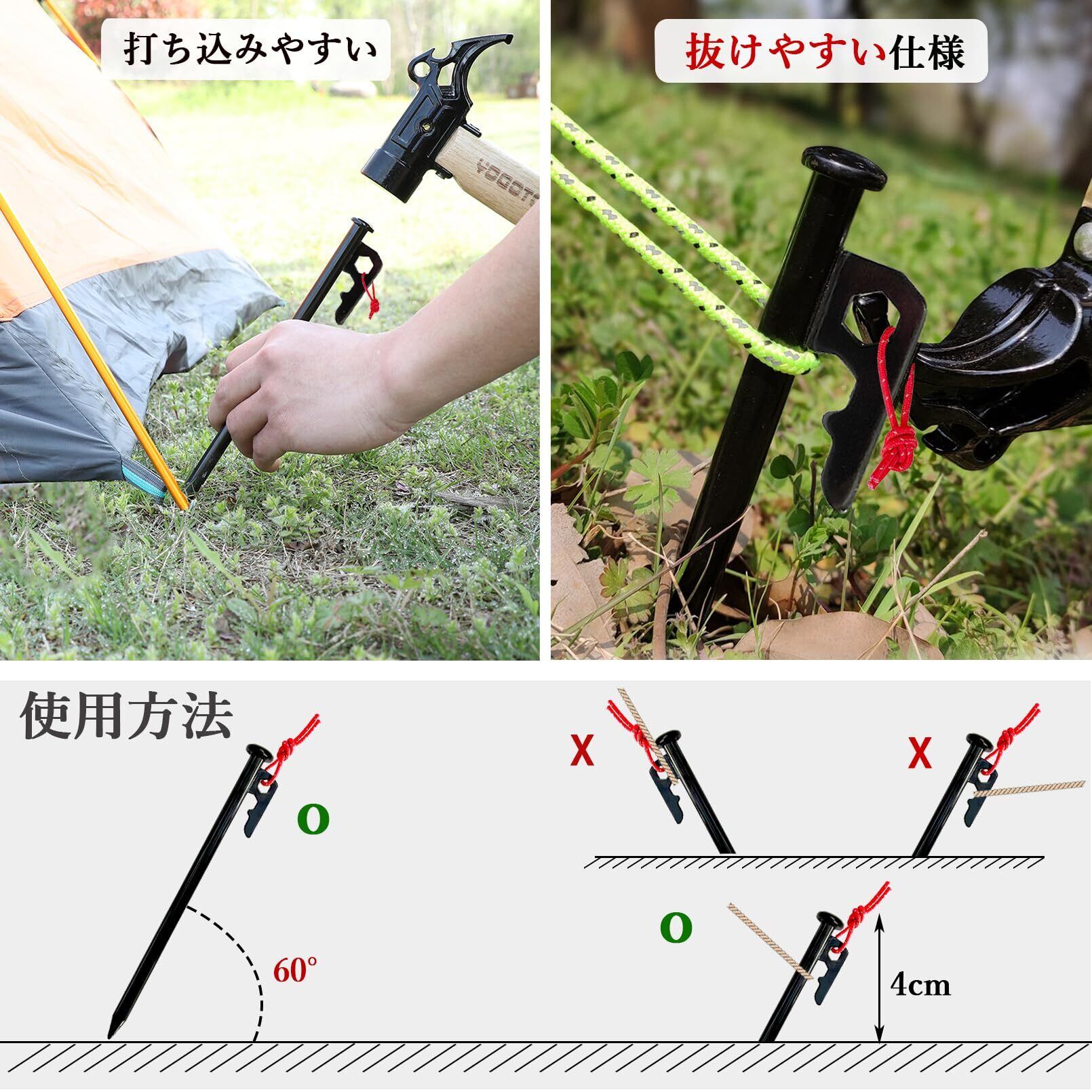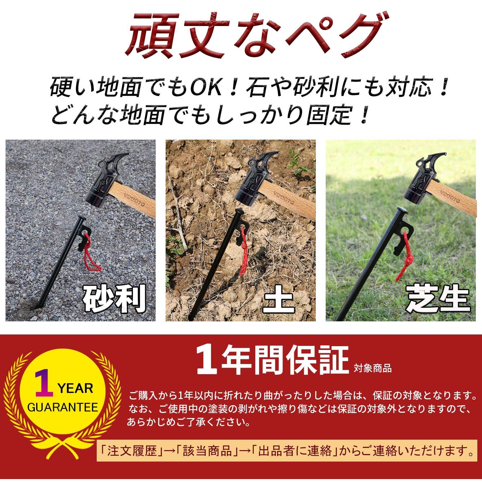 ◆【太めの頭部】①打ち込みやすい頭部(打撃ヘッド)デザインはハンマーからの打撃力を確実にボディに伝え、ガンガン刺さる。②ヘッド部分の耳には反射材入りの固定ロープ付き、高い視認性、夜中の撤収や夜間の転倒防止に役に立つ。紛失しにくくなる。③フック用の穴とフック、ロープなど抜く時の方法にバリエーションがあり、抜く工程が手軽に行える。